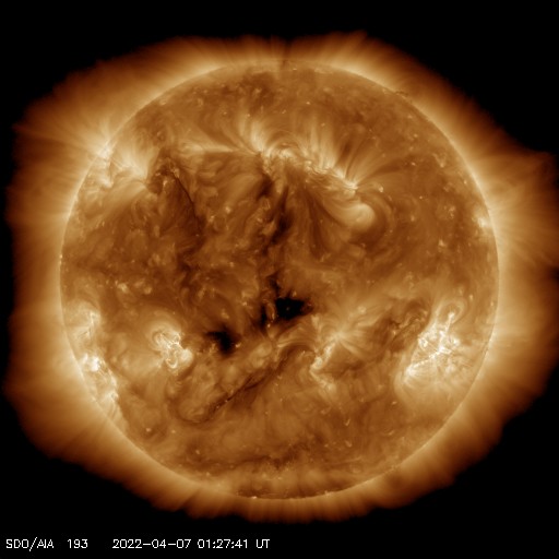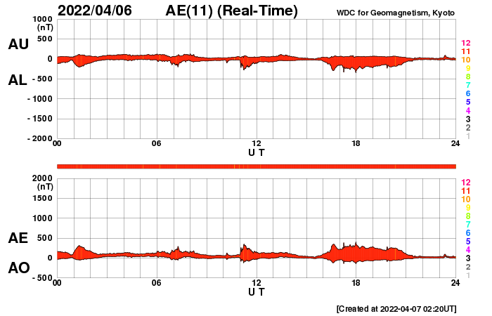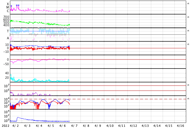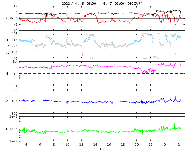 2022/ 4/ 7 11:38 更新 太陽風は平均的な状態です。太陽は穏やかです。 担当 篠原 太陽風は、400km/秒と平均的な速度で安定しています。 磁場強度は、4nTの状態が続いていましたが、 今朝、7日8時(世界時6日23時)頃に、 7nT程度へ少し強まる変化が発生しています。 同時に、太陽風の密度も小幅の急な増加が発生しています。 変化が小さいのではっきりしませんが、 注目していた3日深夜のCMEによる乱れが 到来したのでしょうか。 この程度の変化であれば、 磁気圏への影響は特に見られないままで推移しそうです。 現在の磁気圏は概ね静穏で、 AE指数は小規模の変化が時々発生している程度です。 SDO衛星AIA193では、 中心部にコロナホールが見えています。 3日後くらいに太陽風速度の高まりが見られるかもしれません。 今日の写真では横方向の広がりが見えています。 太陽風に変化が発生した場合、どの様な推移になるでしょうか。 太陽は、西の端(右端)でC3.1と、 中心部南東(左下)の2985群でC1.2の小規模フレアが発生した程度で、 穏やかな状態です。 黒点相対数が増加しているという話を昨日紹介しましたが、 現在の太陽は黒点が目立たなくなっています。