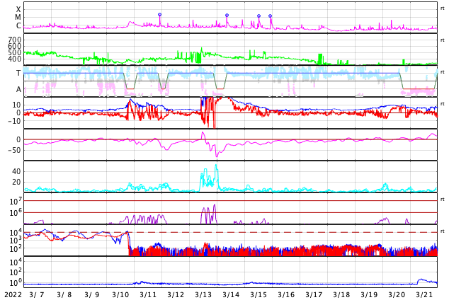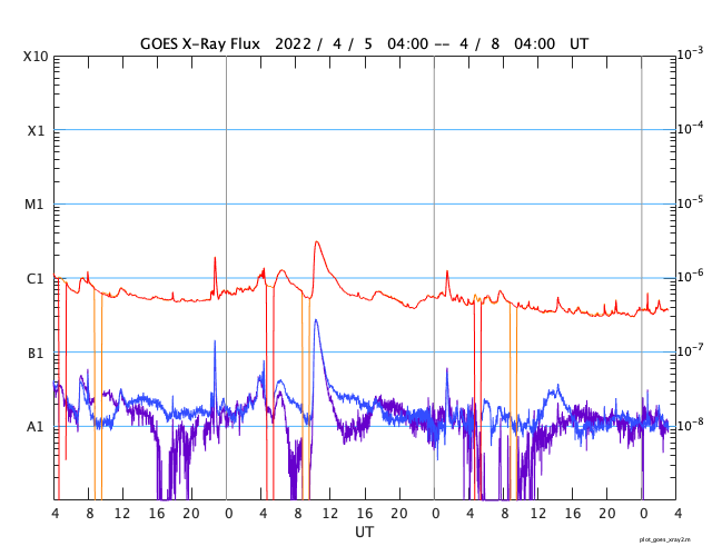 GOES衛星の太陽X線強度。赤・橙 = 0.1〜0.8 nm、青・紫 = 0.05〜0.4 nm (c) データ:NOAA/SWPC、作図:宇宙天気ニュース ![]() | |||||||||||||||||||||||||||||||||||||||||||||||||||||||||||||||||||||||||||||||||||||||||||||||||||||||||||||||||||||||||||||||||||||||||||||||||||||||||||||||||||||||||||||||||||||||||||||||||||||||||||||||||||||||||||||||