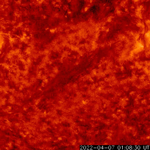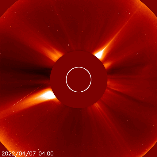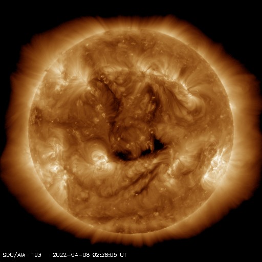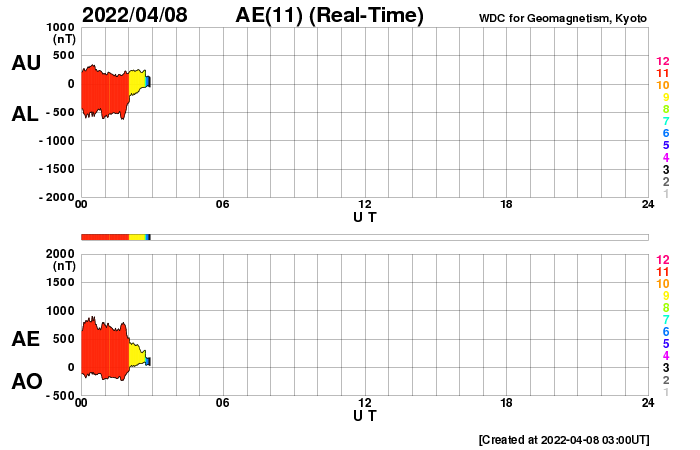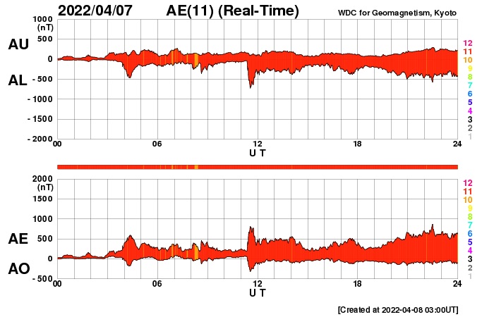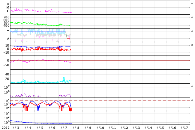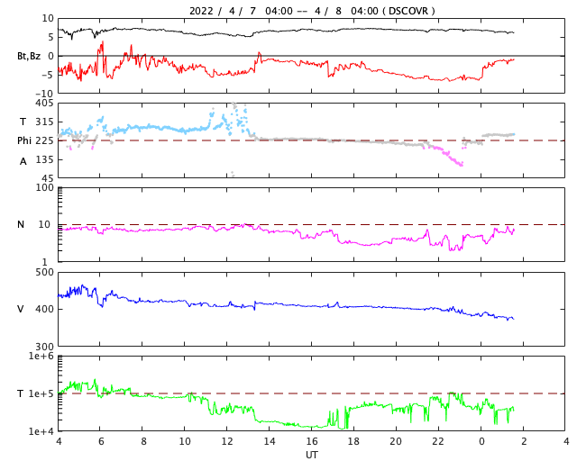 2022/ 4/ 8 12:14 更新 太陽風磁場が南寄りになり、磁気圏の活動がやや強まりました。フィラメント噴出が発生しています。 担当 篠原 昨日のニュース以降、 太陽風の速度は450km/秒に少し高まりましたが、 すぐに400km/秒へ下がっています。 グラフの最後で380km/秒へ少し下がっていて、 この後、低速の状態になるかもしれません。 磁場強度は、7nT前後に少し強まったところで安定し、 南北成分が南向きに偏って変化する様になっています。 このため、磁気圏の活動はある程度強まって、 AE指数は500〜800nTの中規模の変化が連続的に発生しています。 太陽風のグラフの最後で、 磁場の南北成分は0nTに近付いています。 この状態が続くと、磁気圏は穏やかになるでしょう。 SDO衛星AIA193では、 太陽の中心部の南側にコロナホールが見えています。 明後日くらいからこの領域の影響で 太陽風の速度が高まる可能性があります。 太陽では、昨日の昼、7日13時(世界時7日4時)頃に、 中心部の南側でフィラメント噴出が発生しています。 SDO衛星AIA304による動画を掲載します。 このフィラメントは今週初めから注目していたのですが (4月4日以降の記事のSDO衛星AIA193の画像で良く見えていました)、 とうとう噴出しました。 SOHO衛星LASCO C2によると、 南東(左下)に向かってCME(コロナ質量放出)が発生しています。 ただし、発生地点は太陽の中心線にあるので、 コロナのガスは、地球の方向にも飛び出しているかもしれません。 2〜3日後に磁場の強まりなどが到来する可能性がありますが、 前に紹介したコロナホールの影響と重なってしまいそうです。 太陽は、フレアの発生はなく、 全体としては穏やかな状態です。