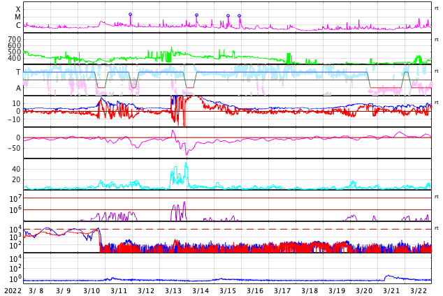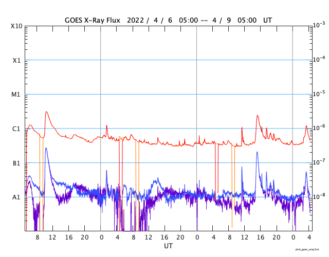 GOES衛星の太陽X線強度。赤・橙 = 0.1〜0.8 nm、青・紫 = 0.05〜0.4 nm