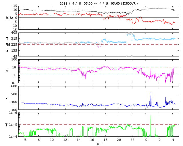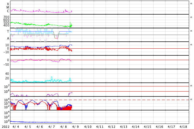 2022/ 4/ 8 12:14 太陽風磁場が南寄りになり、磁気圏の活動がやや強まりました。フィラメント噴出が発生しています。
