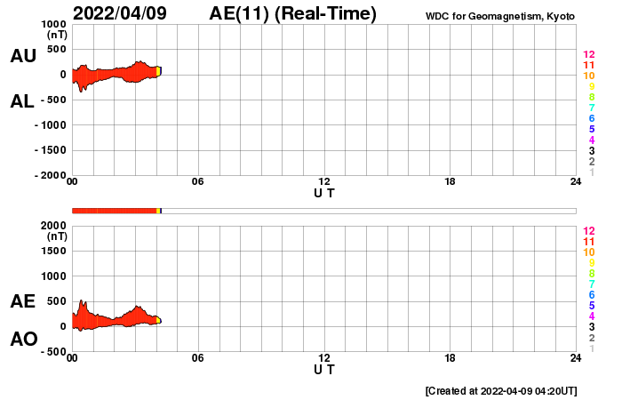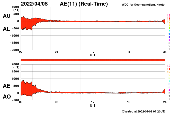 下段のAEグラフの値が高くなると、オーロラ活動が活発化しています。