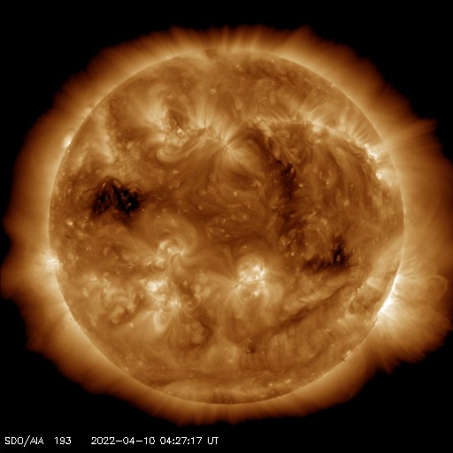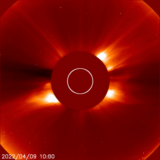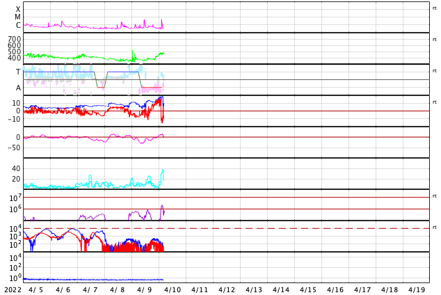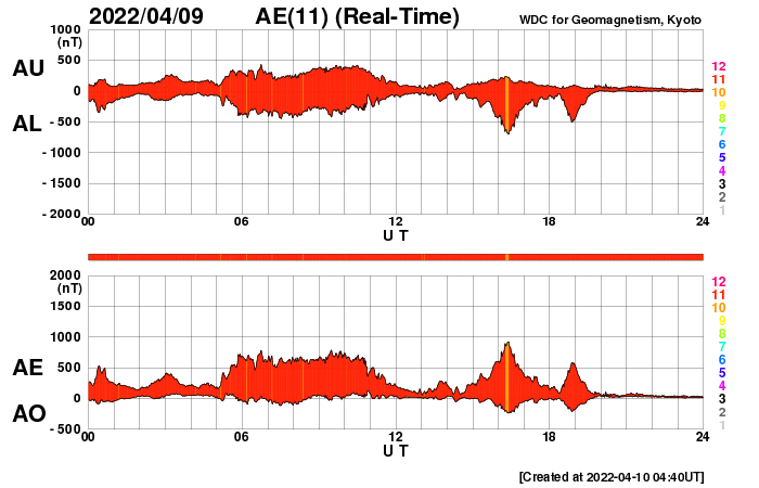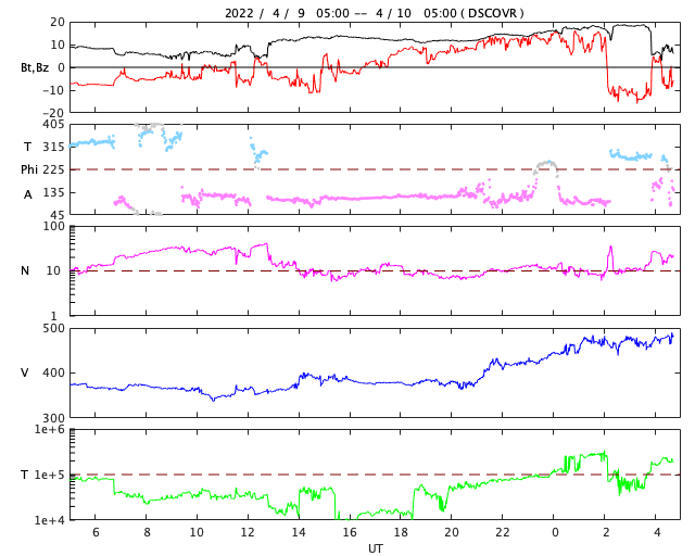 2022/ 4/10 13:55 更新 太陽風は磁場が強まり、やや高速になっています。 担当 篠原 昨日、10nTに強まっていた太陽風の磁場強度は、 ニュース以降はゆっくりと下がり、 夕方には5nTと平均的な値に戻っていました。 しかし、夜になると再び10nTに強まる変化が到来し、 今日の昼にかけて18nTに達していました。 現在は、グラフの最後で5nTへ急に下がる変化が発生しています。 太陽風の速度は、 磁場が強まってしばらく過ぎた今朝早くから上昇を始め、 380km/秒のやや低速の状態から、 現在は470km/秒とやや高速になっています。 コロナホールの高速太陽風に、 CMEによる乱れが重なっているのでしょうか。 太陽風は様々な変化を見せています。 太陽風磁場の南北成分は、 グラフの前半は南寄りで、中盤から北寄りに変わり、 後半で -10nTを超える強い南向きが2時間ほど発生しています。 AE指数のグラフも、 前半では500nTを超えるくらいの中規模の変化が続き、 その後は静かになってます。 最後に強い南向きの影響の活動の強まりが発生していますが、 今のところ変化は500nT程度です。 太陽風のグラフの最後で磁場は南北に変化していて、 この後の傾向は分かりませんが、 南寄りの状態が続くと、速度が少し高まっているので、 磁気圏の活動も強まりやすくなります。 速度の高まりも含めて、引き続き注目してください。 太陽は、昨日の午後、9日14時(世界時9日5時)頃から、 南側でプロミネンス噴出が発生しています。 GOES衛星SUVI 304の動画を掲載します。 巨大なコロナのループがゆっくりと噴き上がっています。 この噴出によるCME(コロナ質量放出)が、 太陽の右下に向かって飛び出しています。 地球に対しては横方向の噴出なので、 影響はなさそうです。 太陽は、中心部の2985黒点群が見えなくなり、 北西(右上)の2983群だけになっています。 2983群が西の端に沈むと、 久しぶりに無黒点になるのでしょうか。 フレアは、南西の端(右下)に沈んだ2978群の領域で、 C4.7とC4.9の小規模フレアが発生しています。 ![]() 太陽の南側で発生したプロミネンス噴出。GOES衛星SUVI 304。 (c) GOES (NOAA/SWPC)、(動画加工 : 宇宙天気ニュース) ![]() プロミネンス噴出によるCME。SOHO衛星LASCO C2、C3。 (c) SOHO (ESA & NASA)、 (動画加工 : 宇宙天気ニュース) ![]() SDO衛星のAIA193カメラによる太陽コロナの様子 (c) SDO (NASA) ![]() SDO衛星による太陽の可視光写真。マウスの矢印を写真に重ねると、黒点番号付きの写真に切り替わります。 (c) SDO (NASA) ![]() DSCOVRが観測した太陽風の磁場(黒線は全体の強度、赤線は南北成分) 磁場の向き、プラズマの密度、速度、温度 (c) データ:NOAA/SWPC、作図:宇宙天気ニュース ![]() AE指数(速報値) 下段のAEグラフの値が高くなると、オーロラ活動が活発化しています。 (c) 京都大学WDC ![]() ![]() 27日の太陽周期に合わせた図 太陽が同じ面を地球に向けていた27日前の変化から、今後を予想することができます。 (c) 作図:宇宙天気ニュース