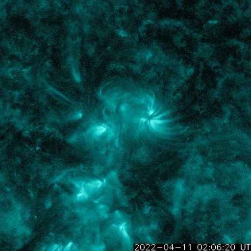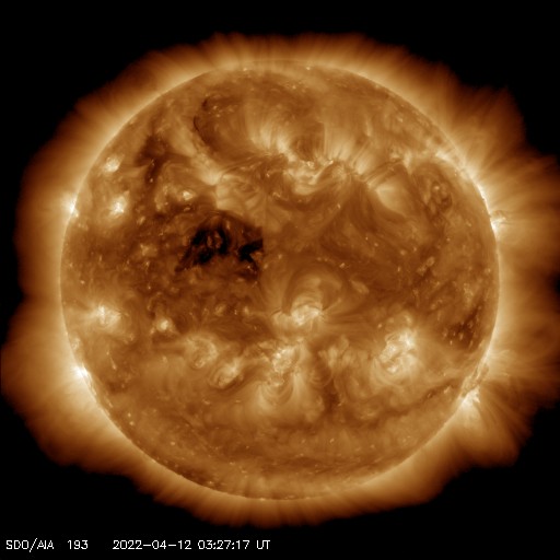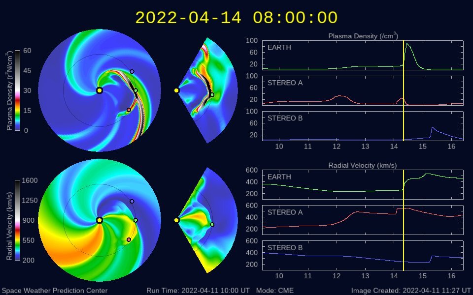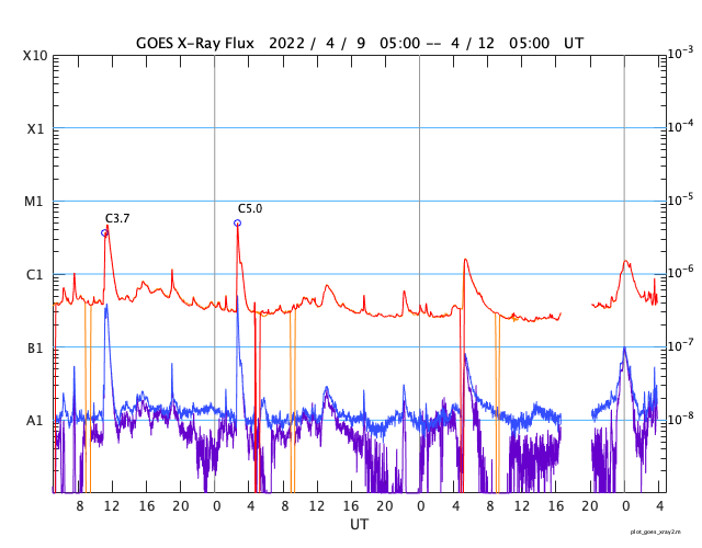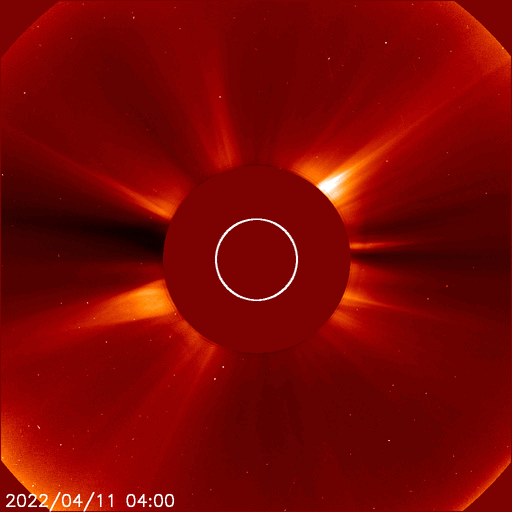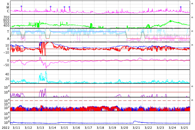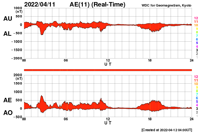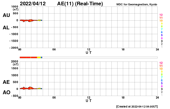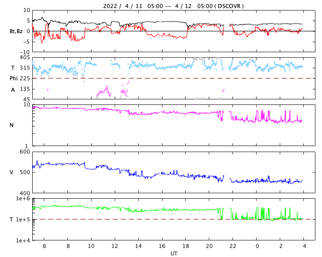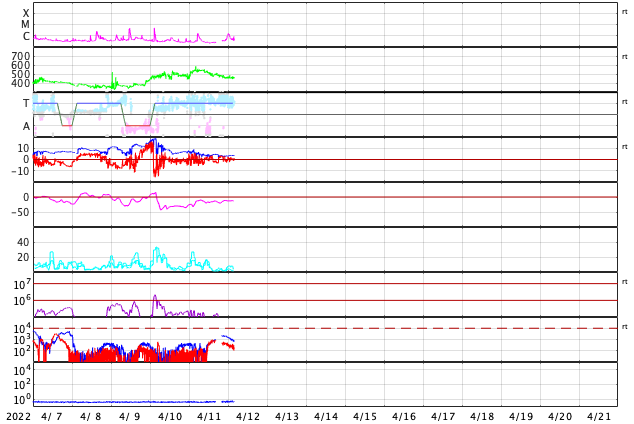 2022/ 4/12 13:08 更新 ハロー型のCMEが発生し、太陽風の乱れが地球に向かっています。 担当 篠原 昨日のニュースの最後でお知らせした、 11日14時(世界時11日5時)に太陽中心部の南側で発生した C1.6の小規模フレアの詳しい動画を掲載します。 SDO衛星のAIA131(青)、193(茶)、304(赤)の 3種類の画像を並べています。 193(茶)の画像では、 フレアの前にS字になったフィラメントの暗い筋が良く見えていて、 これが弾ける様に吹き飛ばされています。 太陽全体の画像では、193ではコロナの中の衝撃の広がりや、 304(赤)では薄暗いコロナのガスの噴き上がりなど、 興味深い変化が見えています。 SOHO衛星LASCO C2、C3では、 太陽全体を丸く囲む様に広がる、 ハロー型のCME(コロナ質量放出)が撮影されています。 吹き出す方向に偏りがなくて、見事に丸い形に広がっています。 噴出の様子から、地球への到来は間違いなしという状況ですが、 NOAA/SWPCの太陽風予報では、 明後日の夕方、14日17時(世界時14日8時)頃に 地球に達する可能性があるとのことです。 今日のSDO衛星AIA193の太陽の中心部北東側(左上)に見える コロナホールによる太陽風速度の高まりと 重なる様な変化になりそうです。 磁場の強まりがやって来て、南向きに大きく変化すると、 磁気圏の活動が激しくなる可能性があります。 太陽風の変化と磁気圏の推移に注目して下さい。 現在の太陽は、北東の端近く(左上)に2988黒点群が見えるだけです。 X線グラフは、右端近くにC1.5の小規模フレアが発生していますが、 これは、南西の端(右下)で発生しています。 太陽風は、速度が550km/秒から450km/秒へ下がり、 平均的な速度に戻りかけています。 コロナホールの影響は通り過ぎつつある様です。 磁場強度は、5nTから3〜4nTへ少し下がり、 やや弱くなっています。 AE指数は、300〜500nTの小規模の変化が発生していて、 ある程度活動的でしたが、 太陽風の速度が下がってきたので、この後は穏やかになりそうです。 次の高まりは、今日紹介したCMEの乱れと、 SDO衛星AIA193の太陽の中心部に見える コロナホールの影響になりそうです。