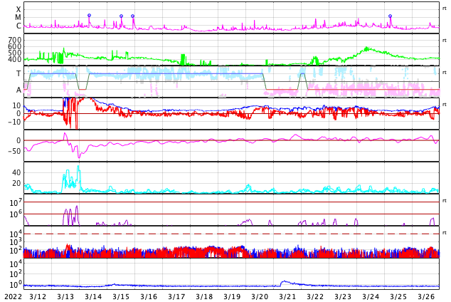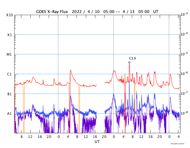 GOES衛星の太陽X線強度。赤・橙 = 0.1〜0.8 nm、青・紫 = 0.05〜0.4 nm (c) データ:NOAA/SWPC、作図:宇宙天気ニュース ![]() | |||||||||||||||||||||||||||||||||||||||||||||||||||||||||||||||||||||||||||||||||||||||||||||||||||||||||||||||||||||||||||||||||||||||||||||||||||||||||||||||||||||||||||||||||||||||||||||||||||||||||||||||||||||||