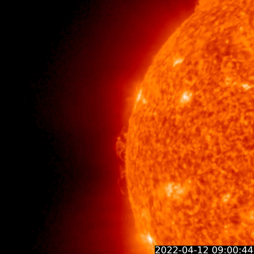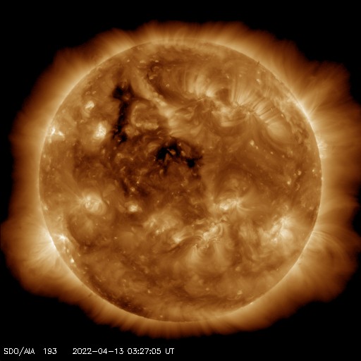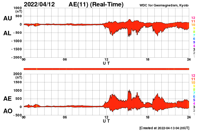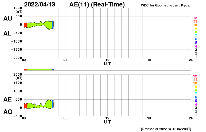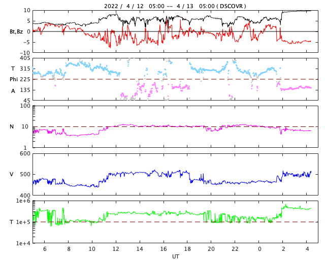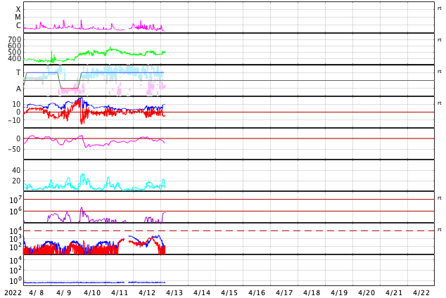 2022/ 4/13 13:39 更新 太陽風は速度や磁場が度々強まっています。 担当 篠原 太陽風は、昨夜に450km/秒から500km/秒へ速度が上がり、 未明に450km/秒へ下がって、昼前に500km/秒へ上がるという、 上下の変化が発生しています。 磁場強度も、4nTから5〜8nTへ少し強まり、 昼前からは10nTに強まっています。 細かい変化が続いていて、原因との対応が読み取りにくくなっています。 SDO衛星AIA193を調べると、 9日23時(世界時9日14時)と10日22時(世界時10日13時)に、 太陽中心部の南東側(左下)で小さい爆発が発生していました。 この時に発生したCMEが 2日半〜3日程かかって地球に到来したのでしょうか。 昨日紹介した11日14時(世界時11日5時)のCMEによる乱れも、 明日の午後に到来が予想されています。 太陽風の変化に引き続き注目してください。 太陽風磁場の南北成分は南寄りの変化が続き、 グラフの最後では、-5nTに振れた状態が続いています。 磁気圏の活動は高まっていて、 AE指数は500〜1000nTの中規模の変化が連続的に発生しています。 現在は南向きが続いているので、この後の活動も高まりそうです。 太陽は、昨日の午後から北西の端(右上)の少し向こう側で活動が強まり、 C3.8に続いて、C1台の小規模フレアが6回ほど発生しています。 領域は向こう側へ去って行くので、この後は見えなくなります。 一方、GOES衛星SUVI 304を見ると、 太陽の東端(左端)の向こう側で活動が続いている様で、 コロナの筋が上空へ伸びていく様子が繰り返し撮影されています。 (動画を掲載しています) この後、どの様な領域が現れるでしょうか。 黒点は、北東側に2988群と新しく2989群が現れています。