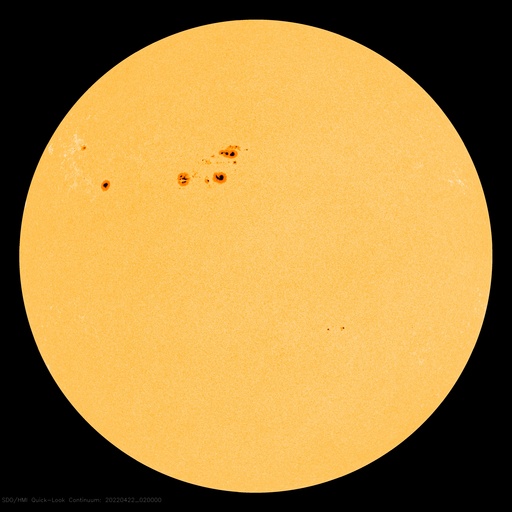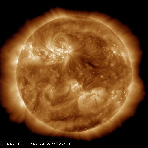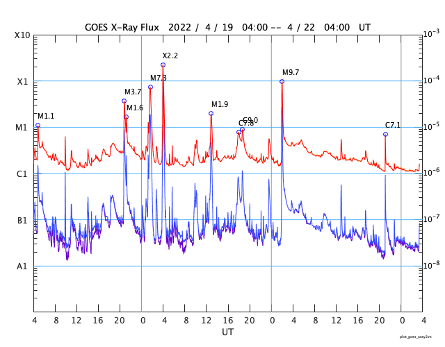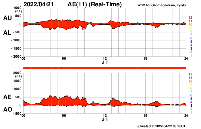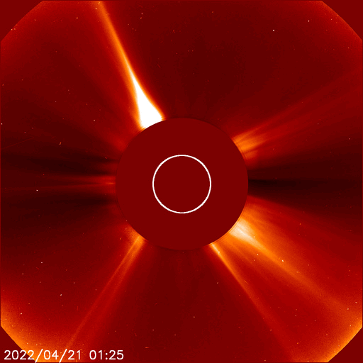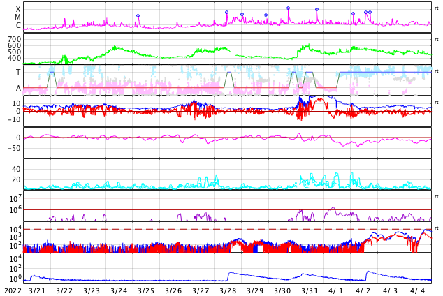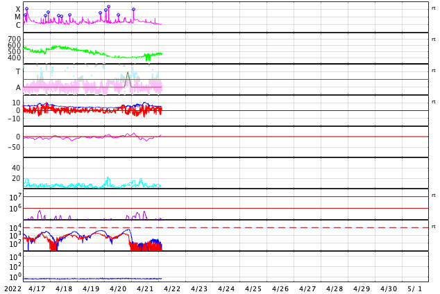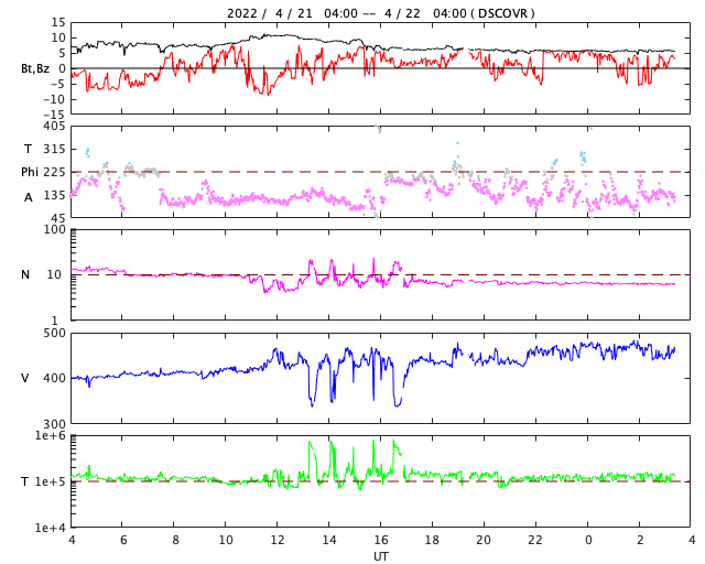 2022/ 4/22 12:38 更新 太陽ではCクラスのフレアが続いています。太陽風はやや高速になっています。 担当 篠原 昨日発生したM9.6の中規模フレアの後の CME(コロナ質量放出)の様子を、 SOHO衛星LASCO C2、C3の動画で紹介します。 太陽から左上に向かって淡いガスが飛び出している様子が見えます。 特に激しい噴出ではないことと、横方向に飛び出しているので、 地球への影響は特になさそうです。 太陽の中心部北側の2993、2994黒点群では、 昨夜から今朝にかけて、C5.4、C3.1、C7.0の小規模フレアや、 その他にも小さいフレアが頻繁に発生しています。 黒点としても大きい姿を保っており、 引き続き活動に注目して下さい。 STEREO Ahead衛星によると、 この後は、東端の南半球側(左下)から活動的な領域が現れそうです。 2〜3日後くらいになりそうですが、 どのような領域が現れるでしょうか。 太陽風は、速度が400km/秒から470km/秒へゆっくり上がり、 やや高速になっています。 磁場強度は、一時的に10nTに強まりましたが、 現在は 5nTと平均的な状態に戻っています。 磁場の南北成分は、図の前半は南北に変化していて、 南向きになった頃に、AE指数で500nTの変化が発生しています。 図の後半では、磁場は北寄りになっていて、 AE指数の変化は少なくなっています。 SDO衛星AIA193では、 太陽の中心部に目立つほどのコロナホールはなく、 太陽風は、基本的には穏やかに推移しそうです。