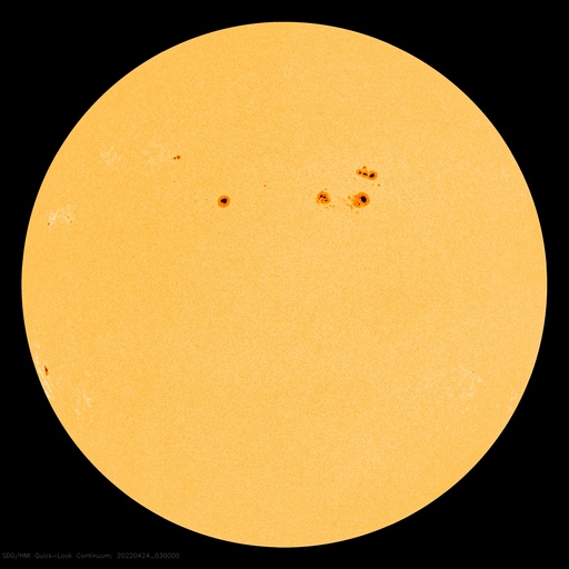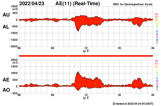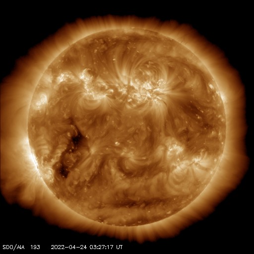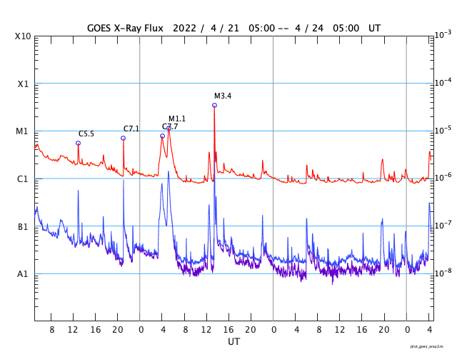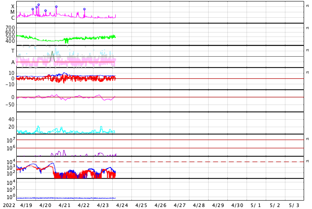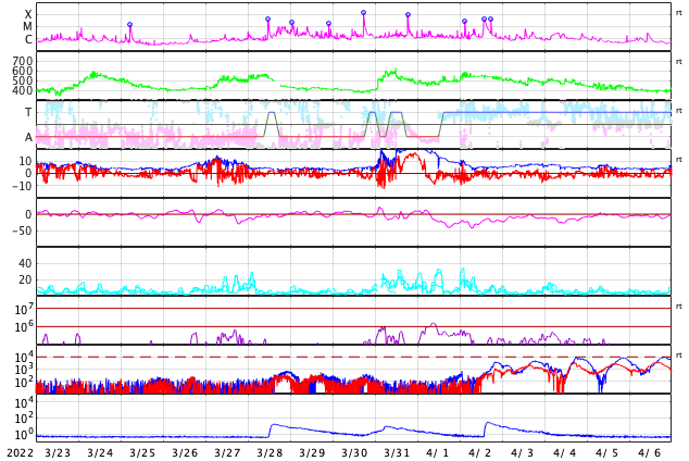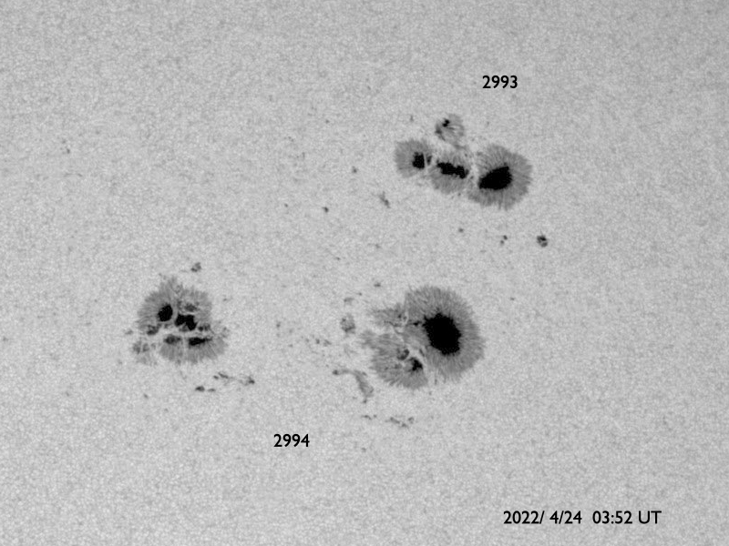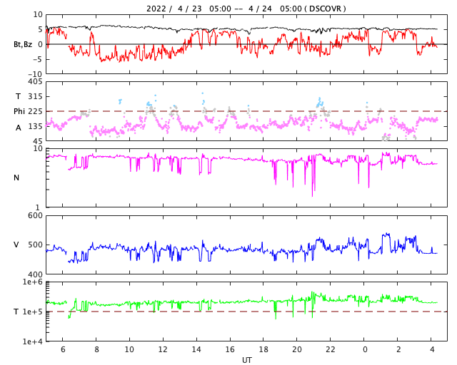 2022/ 4/24 13:40 更新 太陽のフレアは落ち着いています。太陽風の速度が高まっています。 担当 篠原 昨日のニュース以降、太陽の活動は落ち着いていて、 2993、2994黒点群でC1〜2の小規模フレアが7回と、 つい先ほど、24日13時(世界時24日4時)に、 2933群でC3.7の小規模フレアが発生した程度です。 可視光写真では、南東の端(左下)から新しい黒点が現れています。 STEREO Ahead衛星によると、 この向こう側にも活動的な領域がある様で、 続いて黒点が現れる可能性があります。 注目してください。 太陽風は、グラフの値が不安定で読み取りにくいのですが、 速度は500km/秒程度に高まっている様です。 3日ほど前に太陽の中心部に見えていた 小さいコロナホールの影響かもしれません。 磁場強度は5nTと平均的な状態です。 南北成分は、ゆっくりと南北に変化しています。 南向きになったところで、 AE指数に500〜1000nTの中規模の変化が発生しています。 太陽風速度の高まりは、この後どの様に推移するでしょうか。 今日のSDO衛星AIA193では、 太陽の南東(左下)のコロナホールが良く見える様になっています。 5日後くらいにこの領域の影響が始まりそうです。 ![]() 2993、2994黒点群の拡大写真。SDO衛星。 (c) SDO (NASA)、作図:宇宙天気ニュース ![]() SDO衛星のAIA193カメラによる太陽コロナの様子 (c) SDO (NASA) ![]() SDO衛星による太陽の可視光写真。マウスの矢印を写真に重ねると、黒点番号付きの写真に切り替わります。 (c) SDO (NASA) ![]() GOES衛星の太陽X線強度。赤・橙 = 0.1〜0.8 nm、青・紫 = 0.05〜0.4 nm (c) データ:NOAA/SWPC、作図:宇宙天気ニュース ![]() DSCOVRが観測した太陽風の磁場(黒線は全体の強度、赤線は南北成分) 磁場の向き、プラズマの密度、速度、温度 (c) データ:NOAA/SWPC、作図:宇宙天気ニュース ![]() AE指数(速報値) 下段のAEグラフの値が高くなると、オーロラ活動が活発化しています。 (c) 京都大学WDC ![]() ![]() 27日の太陽周期に合わせた図 太陽が同じ面を地球に向けていた27日前の変化から、今後を予想することができます。 (c) 作図:宇宙天気ニュース