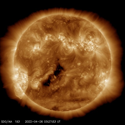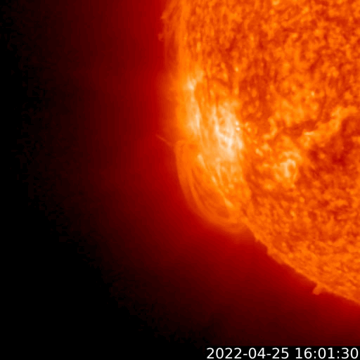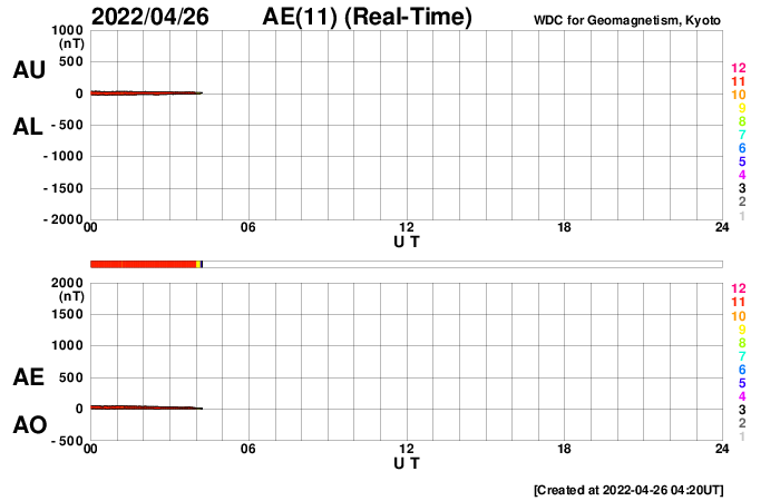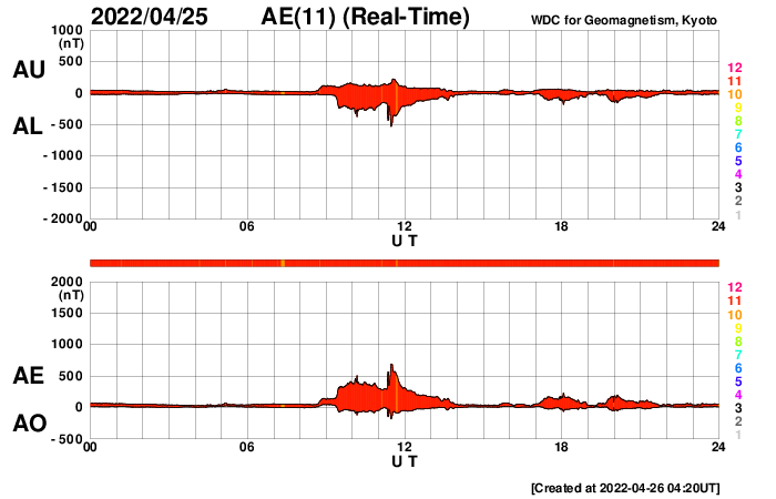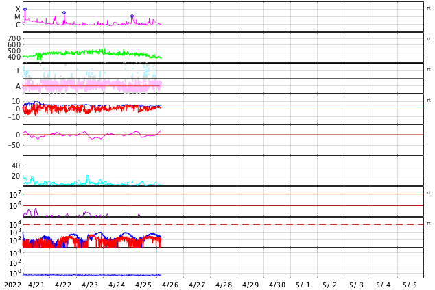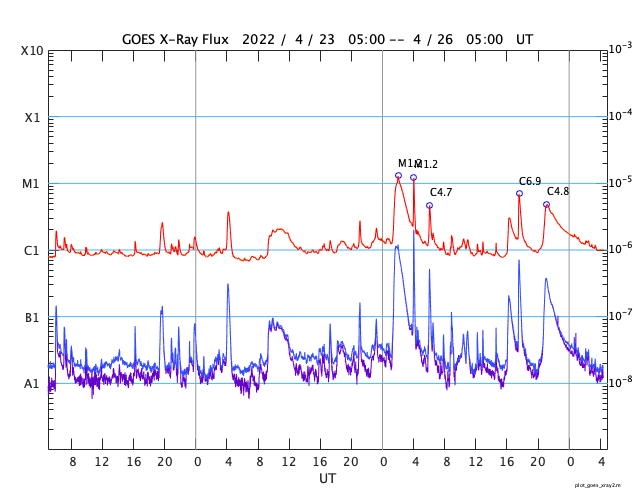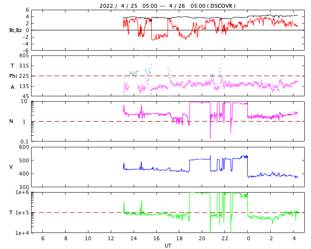 2022/ 4/26 13:31 更新 太陽の南東の端から活動的な領域が近づいています。太陽風はやや低速になっています。 担当 篠原 3月下旬から、ニュースの更新メールとフレアの速報メールについて、 gmailのアドレスへ転送できなかったという通知が 複数返ってくる様になりました(無事に転送されている場合もあります)。 gmailのアドレスへ直接送信するメールは届いている様なので、 必要な場合は、gmailのアドレスでの追加の登録をお願い致します。 (複数のメールアドレスを登録しても問題ありません) 太陽は、南東の端(左下)で活動が見える様になっています。 GOES衛星SUVI 304の動画では、 コロナのガスが飛び出す様子が見えています。 26日2時半(世界時25日17時半)の変化は、 C6.8の小規模フレアとしてX線グラフで観測されています。 活動的な領域はもうすぐこちら側に現れそうです。 注目してください。 北西(右上)の2993、2994黒点群の領域でも、 C4.6、C3.0、C4.8と小規模フレアの発生が続いています。 太陽風は、グラフの途中が乱れていますが、 全体的に速度はゆっくりと下がって、 現在は380km/秒とやや低速になっています。 磁場強度は、4nTと平均的な状態です。 AE指数は、一時的に500nTに達する変化が発生していますが、 その他は変化が小さく、 磁気圏は全体としては穏やかな状態で推移しています。 SDO衛星AIA193では、 中心部の南側にコロナホールが見えています。 3日後くらいからこの領域の影響で太陽風の速度が高まりそうです。
