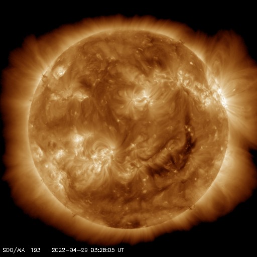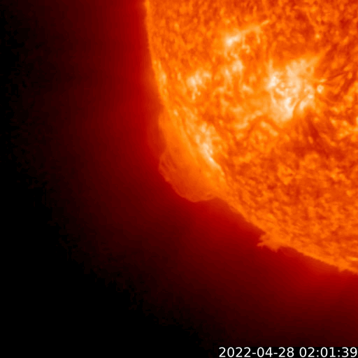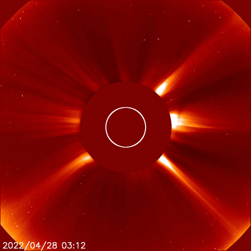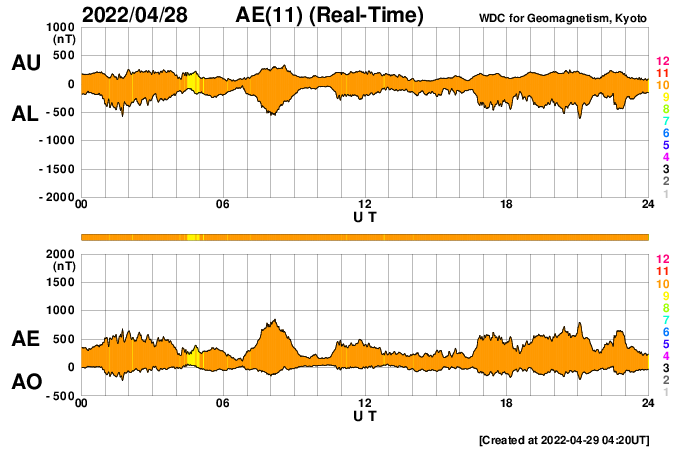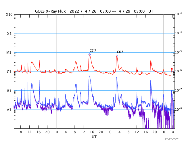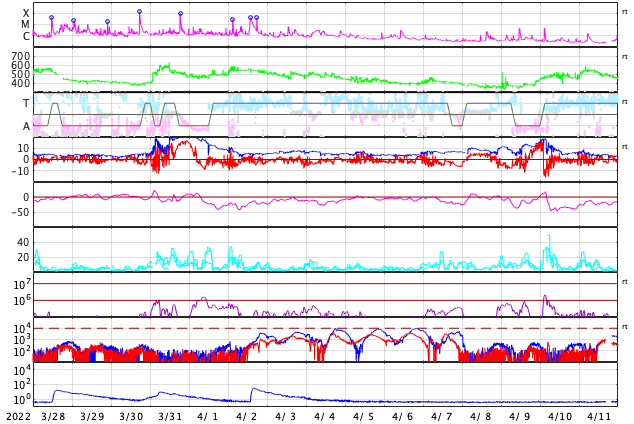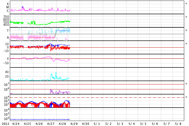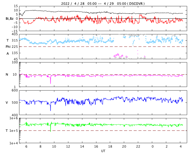 2022/ 4/29 13:31 更新 高速の太陽風が続いています。磁気圏も活動的です。 担当 篠原 太陽の南東の端(左下)で、 大きいプロミネンスの噴出が発生しています。 GOES衛星SUVI 304の動画を掲載します。 28日12時(世界時28日3時)頃からプロミネンスが高まり始めて、 そのまま左下へ飛び出しています。 なかなか見事な光景です。 SOHO衛星LASCO C2、C3では、 CME(コロナ質量放出)が観測されています。 地球に対しては横方向の噴出なので影響はありません。 フレアの活動は、北西の端(右上)に近付いた 2994黒点群で発生したC3.7の小規模フレアが最大で、 C1台の小さいフレアが5回ほど発生した程度です。 全体としては落ち着いてきた印象です。 太陽風は、520km/秒と高速の風が続いています。 磁場強度は、昨日のニュースの頃に10nTに上がりましたが、 その後はゆっくりと下がって、現在は6nTと平均的な値に戻っています。 磁場の南北成分は、-5nTに達するくらいの南寄りの変化が続いています。 磁気圏の活動も高まっていて、 AE指数は500nT前後の中規模の変化が続いています。 SDO衛星AIA193では、太陽の中心部のコロナホールは西側に回り、 3日後くらいには太陽風の速度は低下に向かいそうです。 ![]() 太陽の南東側で発生したプロミネンス噴出。GOES衛星SUVI 304。 (c) GOES (NOAA)、(動画加工 : 宇宙天気ニュース) ![]() 太陽の南東に飛び出すCME。SOHO衛星LASCO C2、C3。 (c) SOHO (ESA & NASA)、 (動画加工 : 宇宙天気ニュース) ![]() SDO衛星のAIA193カメラによる太陽コロナの様子 (c) SDO (NASA) ![]() SDO衛星による太陽の可視光写真。マウスの矢印を写真に重ねると、黒点番号付きの写真に切り替わります。 (c) SDO (NASA) ![]() GOES衛星の太陽X線強度。赤・橙 = 0.1〜0.8 nm、青・紫 = 0.05〜0.4 nm (c) データ:NOAA/SWPC、作図:宇宙天気ニュース ![]() DSCOVRが観測した太陽風の磁場(黒線は全体の強度、赤線は南北成分) 磁場の向き、プラズマの密度、速度、温度 (c) データ:NOAA/SWPC、作図:宇宙天気ニュース ![]() AE指数(速報値) 下段のAEグラフの値が高くなると、オーロラ活動が活発化しています。 (c) 京都大学WDC ![]() ![]() 27日の太陽周期に合わせた図 太陽が同じ面を地球に向けていた27日前の変化から、今後を予想することができます。 (c) 作図:宇宙天気ニュース
