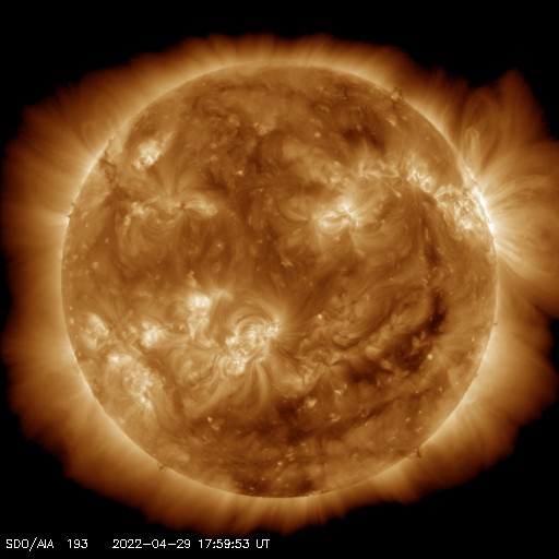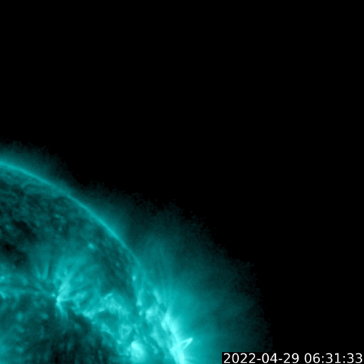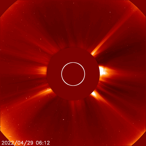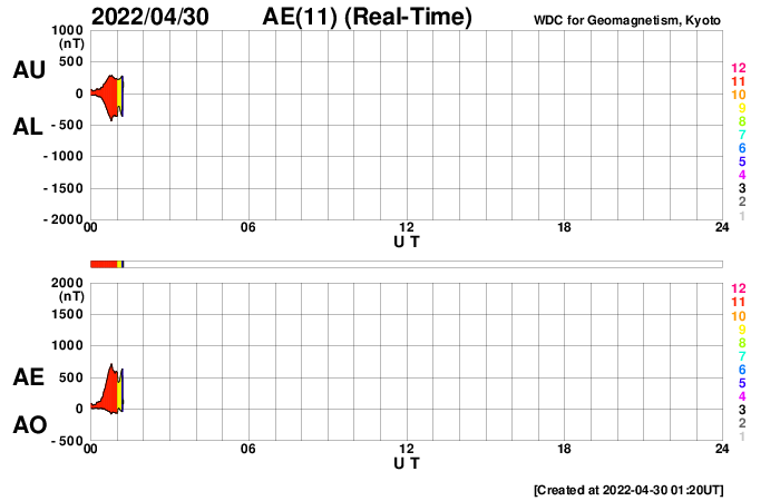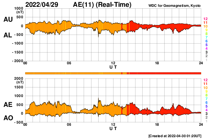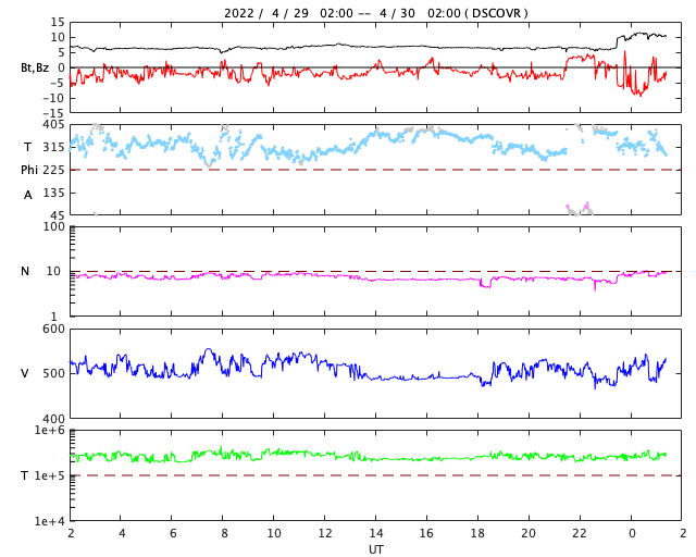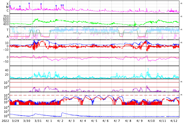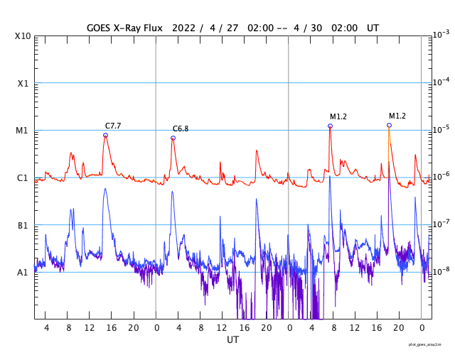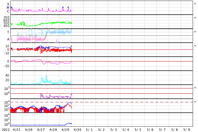 2022/ 4/30 10:31 更新 太陽でM1.2の中規模フレアが2回発生しました。高速の太陽風が続いています。 担当 篠原 昨日の夕方、29日16時(世界時29日7時)に、 太陽の北西(右上)の2996黒点群があった領域 (現在は黒点は見えていません)で、 M1.2の中規模フレアが発生しました。 GOES衛星SUVI 131と304の動画を掲載します。 フレアと共にコロナのガスが右上に向かって 勢い良く飛び出しているのが見えます。 SOHO衛星LASCO C2、C3の動画では、 CME(コロナ質量放出)が噴出しています。 地球に対しては斜め方向ですが、 太陽風の乱れは地球の方向にも向かっているかもしれません。 到来しても小さい規模になると思いますが、 5月2〜3日頃に注目してください。 太陽では、今日未明、30日3時(世界時29日18時)にも M1.2の中規模フレアが発生しています。 太陽の西の端(右端)に達した2994群で発生しています。 太陽の南東側(左下)は、 3001群でC2.2の小規模フレアが発生した程度で、 西端の領域が沈んだ後、太陽は落ち着いた状態になりそうです。 太陽風は500km/秒と高速の風が続いています。 磁場強度は6nTと平均的な値で安定していましたが、 今朝から10nTに強まる変化が発生しています。 磁場の南北成分は弱い南寄りの傾向が続いていましたが、 今朝の磁場の強まり以降、 -8nTくらいに南向きが強まる変化が発生しています。 磁気圏はある程度活動的な状態が続いていて、 AE指数は500nT前議の中規模の変化が続いていました。 今朝の磁場の強まりで一時的に変化が大きくなるかもしれません。 その後は、太陽風磁場の向き方によって変わります。 太陽風の変化に注目して下さい。 SDO衛星AIA193では、コロナホールはだいぶ西に進みました。 一方、中心部から東側にかけてコロナホールは特に見られず、 この後、太陽風の速度が下がると、 太陽風はしばらく穏やかになりそうです。 ![]() 太陽の北西で発生したM1.2の中規模フレア。GOES衛星SUVI 131、304。 (c) GOES (NOAA)、(動画加工 : 宇宙天気ニュース) ![]() M1.2のフレアに伴って発生したCMEの様子。SOHO衛星LASCO C2、C3。 (c) SOHO (ESA & NASA)、 (動画加工 : 宇宙天気ニュース) ![]() SDO衛星のAIA193カメラによる太陽コロナの様子 (c) SDO (NASA) ![]() SDO衛星による太陽の可視光写真。マウスの矢印を写真に重ねると、黒点番号付きの写真に切り替わります。 (c) SDO (NASA) ![]() GOES衛星の太陽X線強度。赤・橙 = 0.1〜0.8 nm、青・紫 = 0.05〜0.4 nm (c) データ:NOAA/SWPC、作図:宇宙天気ニュース ![]() DSCOVRが観測した太陽風の磁場(黒線は全体の強度、赤線は南北成分) 磁場の向き、プラズマの密度、速度、温度 (c) データ:NOAA/SWPC、作図:宇宙天気ニュース ![]() AE指数(速報値) 下段のAEグラフの値が高くなると、オーロラ活動が活発化しています。 (c) 京都大学WDC ![]() ![]() 27日の太陽周期に合わせた図 太陽が同じ面を地球に向けていた27日前の変化から、今後を予想することができます。 (c) 作図:宇宙天気ニュース