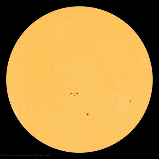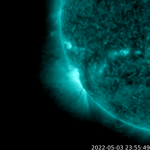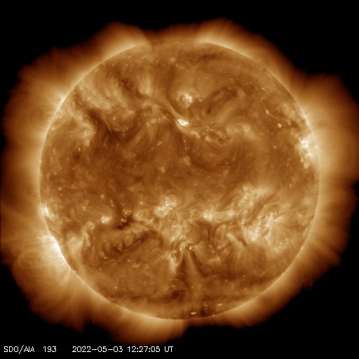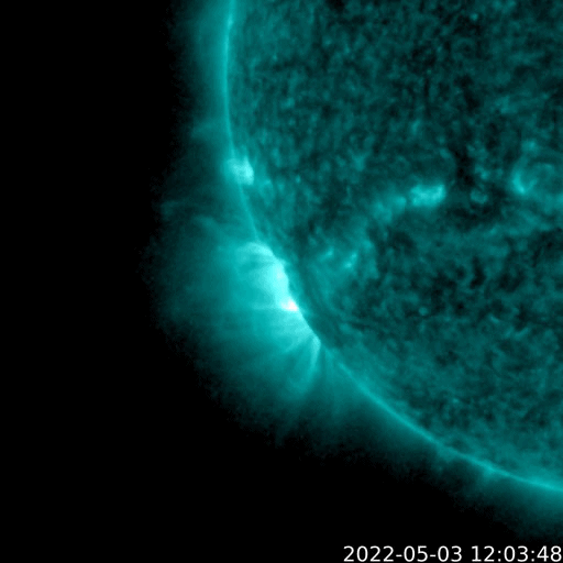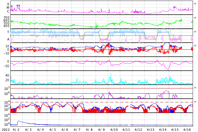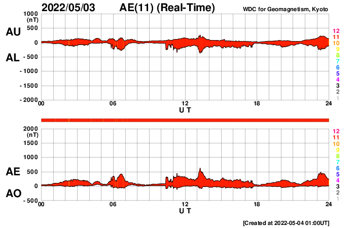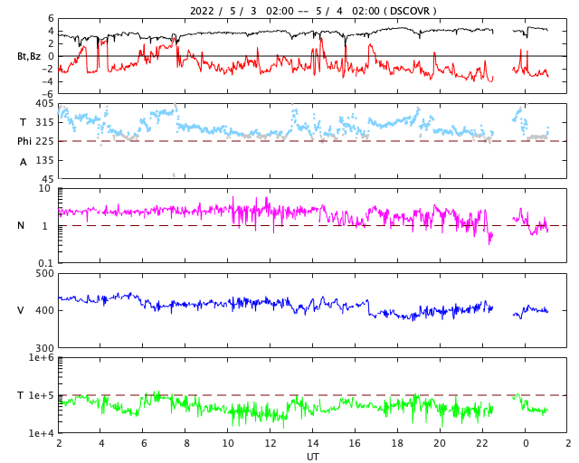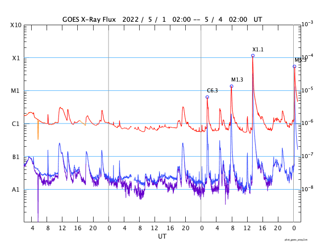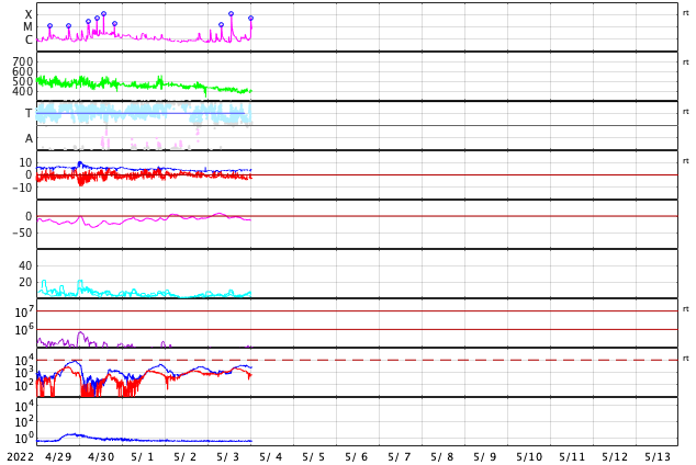 2022/ 5/ 4 10:13 更新 X1.1の大規模フレアが発生しました。活動領域は太陽のこちら側に現れています。 担当 篠原 太陽の南東の端(左下)の領域の活動度が高まり、 昨日のニュースで紹介したC3.2のフレアの後、 3日10時半(世界時3日1時半)にC6.2の小規模フレア、 3日16時半(世界時3日7時半)にM1.3の中規模フレア、 そして、3日22時(世界時3日13時)にX1.1の大規模フレアが発生して、 今朝、4日9時(世界時4日0時)にもM5.3の中規模フレアが発生しています。 Xクラスのフレアは4月30日のX1.1以来で、3日ぶりです。 X1.1とM5.3のフレアの様子を、 GOES衛星SUVI 131の動画で紹介します。 これを見ると、X1.1のフレアは太陽の端ぎりぎりで起きていますが、 M5.3はもうこちら側に現れて発生している様です。 X線グラフを見ると、フレアの規模が 次第に大きくなっている様に見えますが、 X1.1までは太陽の向こう側にあったので、 実際の規模はこの様な推移ではなかった可能性があります。 SDO衛星の可視光写真では、南東の端に黒点が現れています。 もうしばらく待つと、領域の全体が見える様になります。 この後のフレアの発生に注目して下さい。 太陽風は、速度が440km/秒から400km/秒へ少し下がっています。 磁場強度は、4nT前後で安定してます。 太陽風は平均的な状態です。 磁場の南北成分は、-2nT程度の弱い南寄りが続いています。 磁気圏の活動は少し強まって、 AE指数では200〜500nTの小規模の変化が続いています。 SDO衛星AIA193では、コロナホールは見られず、 太陽風は穏やかな状態が続きそうです。 一方、太陽の活動的な領域がこちら側に回ってきたことから、 今後の活動でCME(コロナ質量放出)が発生した時には、 地球へも影響が及ぶ可能性があります。 黒点が太陽の中心に近づくほど注意が必要です。 ![]() 太陽の南東の端で発生したX1.1の大規模フレア。GOES衛星SUVI 131。 (c) GOES (NOAA)、(動画加工 : 宇宙天気ニュース) ![]() 太陽の南東の端で発生したM5.3の中規模フレア。GOES衛星SUVI 131。 (c) GOES (NOAA)、(動画加工 : 宇宙天気ニュース) ![]() SDO衛星のAIA193カメラによる太陽コロナの様子 (c) SDO (NASA) ![]() SDO衛星による太陽の可視光写真。マウスの矢印を写真に重ねると、黒点番号付きの写真に切り替わります。 (c) SDO (NASA) ![]() GOES衛星の太陽X線強度。赤・橙 = 0.1〜0.8 nm、青・紫 = 0.05〜0.4 nm (c) データ:NOAA/SWPC、作図:宇宙天気ニュース ![]() DSCOVRが観測した太陽風の磁場(黒線は全体の強度、赤線は南北成分) 磁場の向き、プラズマの密度、速度、温度 (c) データ:NOAA/SWPC、作図:宇宙天気ニュース ![]() AE指数(速報値) 下段のAEグラフの値が高くなると、オーロラ活動が活発化しています。 (c) 京都大学WDC ![]() ![]() 27日の太陽周期に合わせた図 太陽が同じ面を地球に向けていた27日前の変化から、今後を予想することができます。 (c) 作図:宇宙天気ニュース