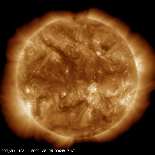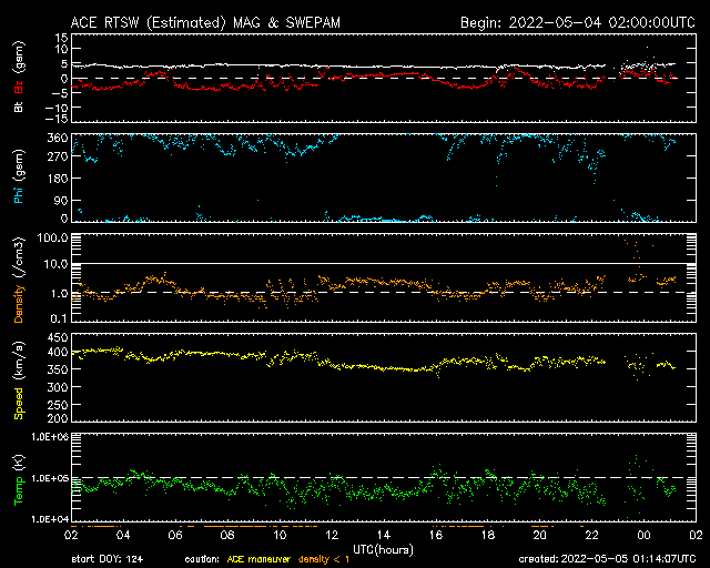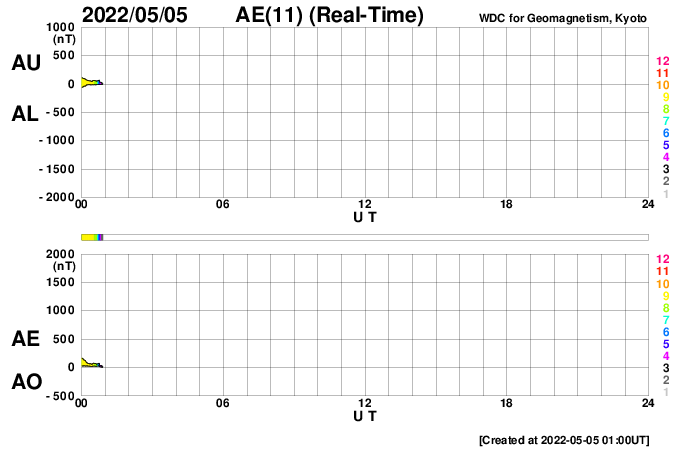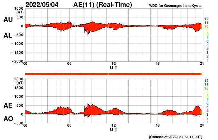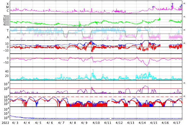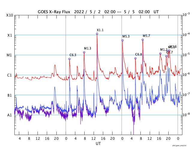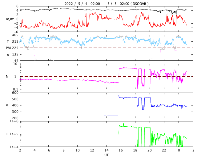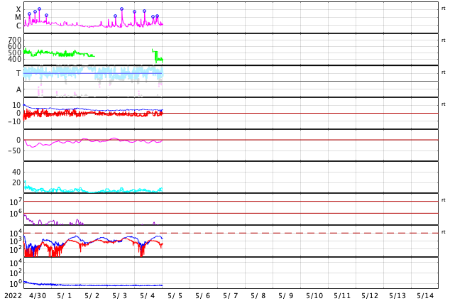 2022/ 5/ 5 10:14 更新 Mクラスの中規模フレアが続いています。太陽風は平均的な状態です。 担当 篠原 昨日のフレア以降、太陽の中心部の3004黒点群の活動が高まり、 夕方、4日18時(世界時4日9時)にM5.7、 深夜、5日1時半(世界時4日16時半)にM1.1、 今朝、5日5時(世界時4日20時)にM1.6の中規模フレアが発生し、 その他にも、C8.6、C4.1など小規模フレアが多数発生しています。 M5.7のフレアの様子をSDO衛星AIA131の動画で紹介します。 AIA131では、この後も活発なフレアの発生を見ることができています。 SOHO衛星LASCO C2によると、 目立つ程のCME(コロナ質量放出)の発生はないようですが、 太陽の中心部の活動なので、 3日後くらいに弱い太陽風の乱れが到来するかもしれません。 3004黒点群は、この2日ほどで大きく発達しています。 ファイルサイズの関係で1日半に絞っていますが、 可視光写真による黒点の変化を動画で紹介します。 また、太陽の南東の端(左下)の3006黒点群でも 昨日、4日14時半(世界時4日5時半)にC6.7の小規模フレア、 今朝、5日4時半(世界時4日19時半)にM1.5の中規模フレアなど、 回数は多くありませんが、フレアの発生が続いています。 今後もフレアの発生に注目して下さい。 太陽風は、DSCOVR衛星のデータが欠けているので、 ACE衛星のグラフも掲載します。 この2つによると太陽風の速度は360〜400km/秒程度と、 平均的か低速くらいで穏やかに推移しています。 磁場強度も4nTと平均的な状態で安定しています。 磁場の南北成分は、南向きの変化が目立っています。 AE指数は200〜500nTの小規模の変化が度々発生していて、 磁気圏はやや活動的になっています。 SDO衛星AIA193では、コロナホールは特に見られず、 太陽風は基本的には穏やかに推移しそうです。 ![]() 3004黒点群で発生したM5.7のフレアの様子。SDO衛星AIA131。 (c) SDO (NASA)、(動画加工 : 宇宙天気ニュース) ![]() 3004黒点群のこの1日半の変化。SDO衛星。 (c) SDO (NASA)、(動画加工 : 宇宙天気ニュース) ![]() SDO衛星のAIA193カメラによる太陽コロナの様子 (c) SDO (NASA) ![]() SDO衛星による太陽の可視光写真。マウスの矢印を写真に重ねると、黒点番号付きの写真に切り替わります。 (c) SDO (NASA) ![]() GOES衛星の太陽X線強度。赤・橙 = 0.1〜0.8 nm、青・紫 = 0.05〜0.4 nm (c) データ:NOAA/SWPC、作図:宇宙天気ニュース ![]() DSCOVRが観測した太陽風の磁場(黒線は全体の強度、赤線は南北成分) 磁場の向き、プラズマの密度、速度、温度 (c) データ:NOAA/SWPC、作図:宇宙天気ニュース ![]() ACEが観測した太陽風の磁場(1番上の枠、白線は全体の強度、赤線は南北成分) および、太陽風の密度(3番目の橙線)、速度(4番目の黄線) (c) NOAA/SWPC ![]() AE指数(速報値) 下段のAEグラフの値が高くなると、オーロラ活動が活発化しています。 (c) 京都大学WDC ![]() ![]() 27日の太陽周期に合わせた図 太陽が同じ面を地球に向けていた27日前の変化から、今後を予想することができます。 (c) 作図:宇宙天気ニュース
