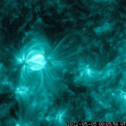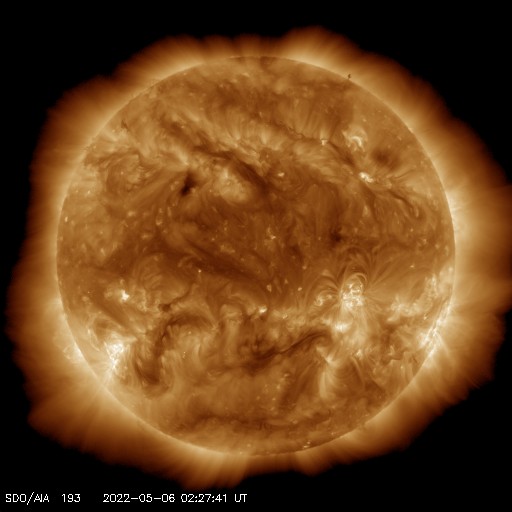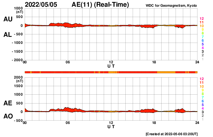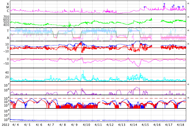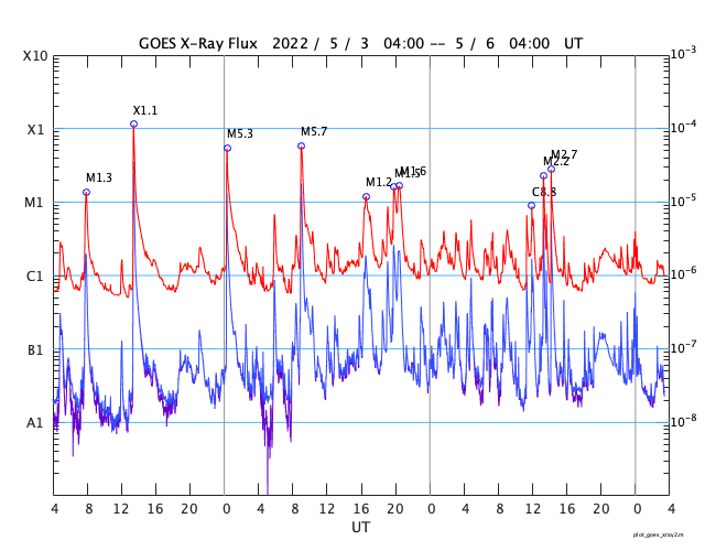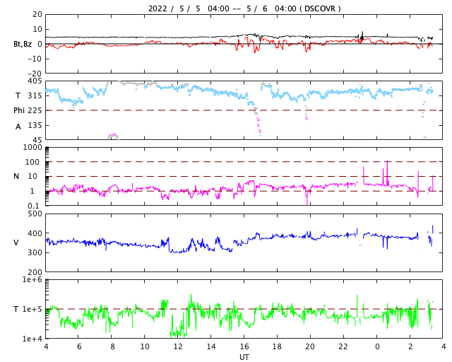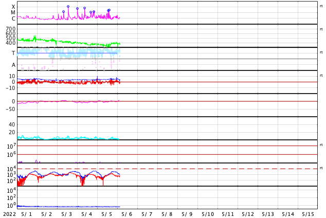 2022/ 5/ 6 12:38 更新 3004黒点群の活動が続いています。太陽風はやや低速で、磁気圏は穏やかです。 担当 篠原 昨日のニュース以降も、 太陽の中心部南西側(右下)の3004黒点群の活動は続き、 NOAA/SWPCによるフレアのリストでは、 5日22時(世界時5日13時)のM2.2の中規模フレアを最大に、 Cクラスの小規模フレアが27回記録されています。 活発な活動の様子をSDO衛星AIA131の動画で紹介します。 頻繁に明るい輝きが発生しています。 このため、X線グラフは細かい変化が多数発生しています。 この変化の途中にぽつぽつと、 南東(左下)の3006群のフレアが混じっていて、 もう一つの中規模フレアである5日23時(世界時5日14時)のM2.7は、 3006群で発生しています。 ただし、X線グラフの終わりの頃は変化が少なくなっていて、 活動はこの後、落ち着くのかもしれません。 もうしばらく注目してください。 また、南東の端(左下)の少し向こう側に活動領域があり、 今日未明、6日3時半(世界時5日18時半)頃に ある程度の規模のフレアが発生した様です。 活動が続く様であれば、 領域がこちら側に現れて、注意が必要になるでしょう。 太陽風は、380km/秒とやや低速の状態です。 磁場強度は、5nTと平均的な状態で安定しています。 磁場の南北成分は、やや北寄りの傾向になっています。 磁気圏は穏やかになり、AE指数は変化が少なくなっています。 SDO衛星AIA193では、コロナホールは特に見られず、 太陽風は穏やかに推移しそうです。