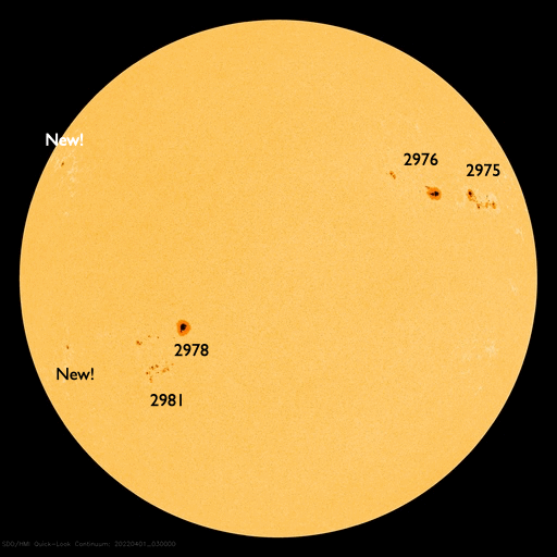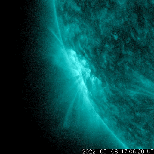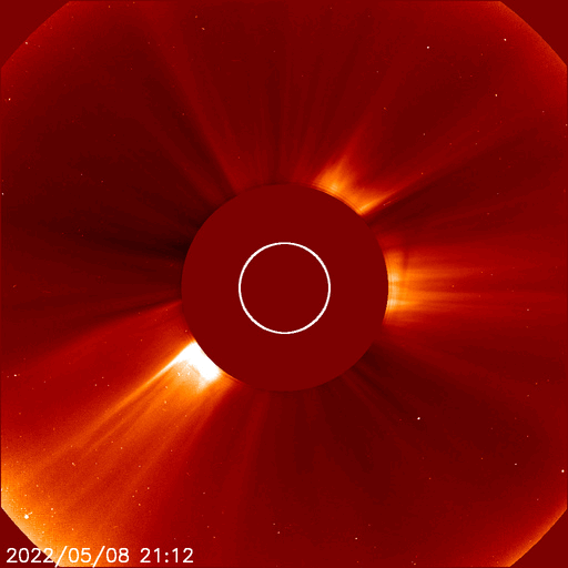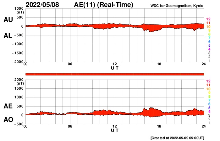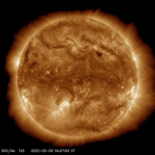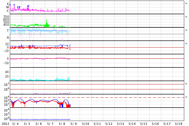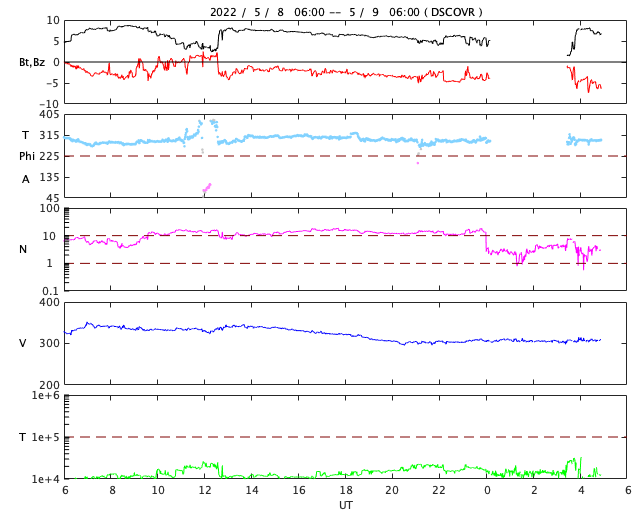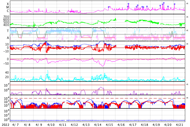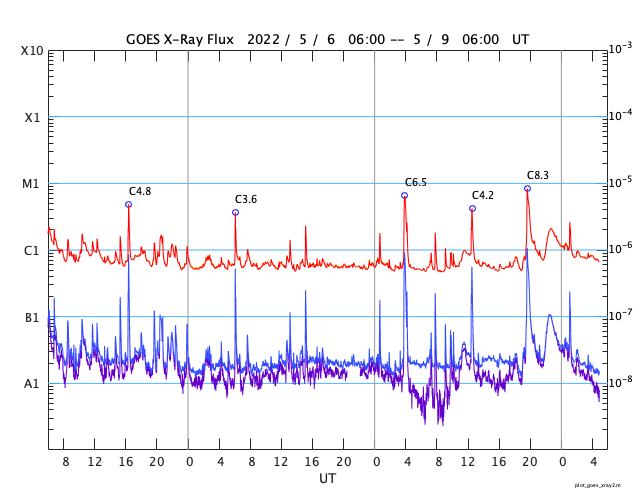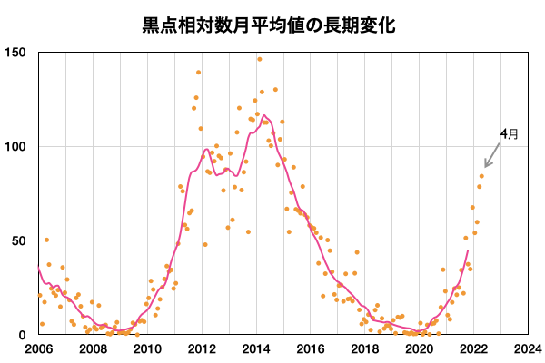 2022/ 5/ 9 14:03 更新 太陽の南東端でフレアが発生しています。4月の黒点相対数は 84.1 でした。 担当 篠原 WDC-SILSOより、4月の黒点相対数は 84.1 と発表されました。 月平均値が80に達するのは、2015年5月の88.8以来で、 およそ7年ぶりです。 先月紹介した様に、前の周期である第24期では、 周期が始まって2年3か月後の2011年3月に 月平均値が70台に達したのですが、 その後半年近く黒点数の増加は止まったようになり、 2011年9月になって、一気に120.1へ増加しています。 (1枚めの図の2011年のデータに注目してください) 今期はこの後どのように増加していくでしょうか。 注目してください。 2枚目に1か月間の動画を掲載します。 3月28日〜4月3日と4月21日〜29日にかけて 黒点相対数の1日値が100を超える日が続きました。 黒点の多い領域が太陽をぐるっと一周して、 月の初めと終わりに黒点相対数の高い期間を作っています。 現在の太陽は、 南西の端(右下)に近付いた3004黒点群で、 C4.1、C1.8などの小規模フレアが、 南東の端(左下)に現れた3007黒点群で C8.2の小規模フレアが発生しています。 C8.2のフレアの様子を、SDO衛星AIA131の動画で紹介します。 このフレアは9日4時半(世界時8日19時半)に発生していますが、 動画では、その後にも太陽の向こう側で発生した フレアの輝きが見えています。 SOHO衛星LASCO C2では、 太陽の向こう側の変化に関係して 左下に向かってCME(コロナ質量放出)が噴出しています。 ある程度規模の大きいフレアだった可能性があり、 この後の活動にも注目してください。 太陽風は、グラフの前半は330km/秒、後半は300km/秒と 低速の風が続いています。 磁場強度は、5〜8nTの間を変化しています。 磁場の南北成分は、弱い南向きが続いています。 磁気圏では弱い影響が見られ、 AE指数は200〜500nTの小規模の変化が続いています。 SDO衛星AIA193は、コロナホールは特に見られず、 穏やかな太陽風はこの後も続きそうです。 ![]() 太陽黒点相対数の長期変化。4月の黒点相対数は 84.1 でした。 (c) 黒点データ:WDC-SILSO、作図:宇宙天気ニュース ![]() 4月の太陽黒点の推移。SDO衛星。 (c) SDO (NASA)、作図:宇宙天気ニュース ![]() 1970年以降の太陽黒点相対数の長期変化。 (c) 黒点データ:WDC-SILSO、作図:宇宙天気ニュース ![]() 太陽の南東の端で発生したC8.2のフレアと太陽の向こう側で発生したフレア。SDO衛星AIA131。 (c) SDO (NASA)、(動画加工 : 宇宙天気ニュース) ![]() 太陽の南東に向かって噴出するCME。SOHO衛星LASCO C2。 (c) SOHO (ESA & NASA)、 (動画加工 : 宇宙天気ニュース) ![]() SDO衛星のAIA193カメラによる太陽コロナの様子 (c) SDO (NASA) ![]() SDO衛星による太陽の可視光写真。マウスの矢印を写真に重ねると、黒点番号付きの写真に切り替わります。 (c) SDO (NASA) ![]() GOES衛星の太陽X線強度。赤・橙 = 0.1〜0.8 nm、青・紫 = 0.05〜0.4 nm (c) データ:NOAA/SWPC、作図:宇宙天気ニュース ![]() DSCOVRが観測した太陽風の磁場(黒線は全体の強度、赤線は南北成分) 磁場の向き、プラズマの密度、速度、温度 (c) データ:NOAA/SWPC、作図:宇宙天気ニュース ![]() AE指数(速報値) 下段のAEグラフの値が高くなると、オーロラ活動が活発化しています。 (c) 京都大学WDC ![]() ![]() 27日の太陽周期に合わせた図 太陽が同じ面を地球に向けていた27日前の変化から、今後を予想することができます。 (c) 作図:宇宙天気ニュース