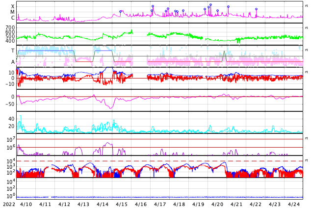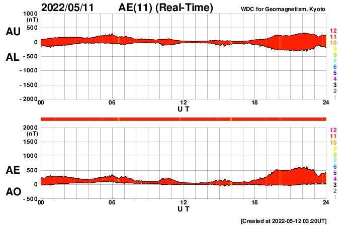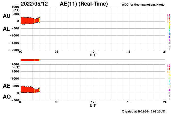 (c) SDO (NASA)、(動画加工 : 宇宙天気ニュース) ![]() SOHO衛星LASCO C2、C3によるCMEの様子。 (c) SOHO (ESA & NASA)、 (動画加工 : 宇宙天気ニュース) ![]() SDO衛星のAIA193カメラによる太陽コロナの様子 (c) SDO (NASA) ![]() SDO衛星による太陽の可視光写真。マウスの矢印を写真に重ねると、黒点番号付きの写真に切り替わります。 (c) SDO (NASA) ![]() GOES衛星の太陽X線強度。赤・橙 = 0.1〜0.8 nm、青・紫 = 0.05〜0.4 nm (c) データ:NOAA/SWPC、作図:宇宙天気ニュース ![]() DSCOVRが観測した太陽風の磁場(黒線は全体の強度、赤線は南北成分) 磁場の向き、プラズマの密度、速度、温度 (c) データ:NOAA/SWPC、作図:宇宙天気ニュース ![]() AE指数(速報値) 下段のAEグラフの値が高くなると、オーロラ活動が活発化しています。 (c) 京都大学WDC ![]() ![]() 27日の太陽周期に合わせた図 太陽が同じ面を地球に向けていた27日前の変化から、今後を予想することができます。 (c) 作図:宇宙天気ニュース