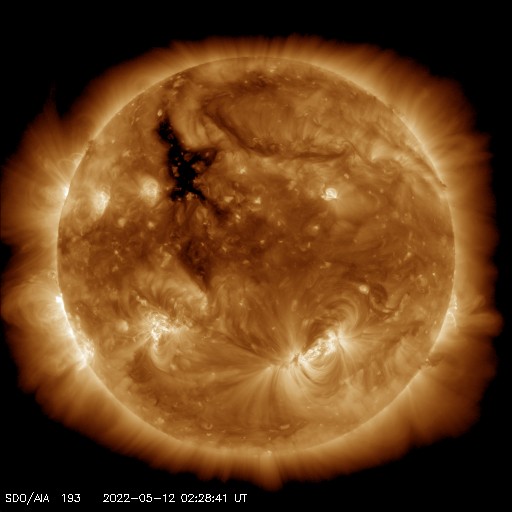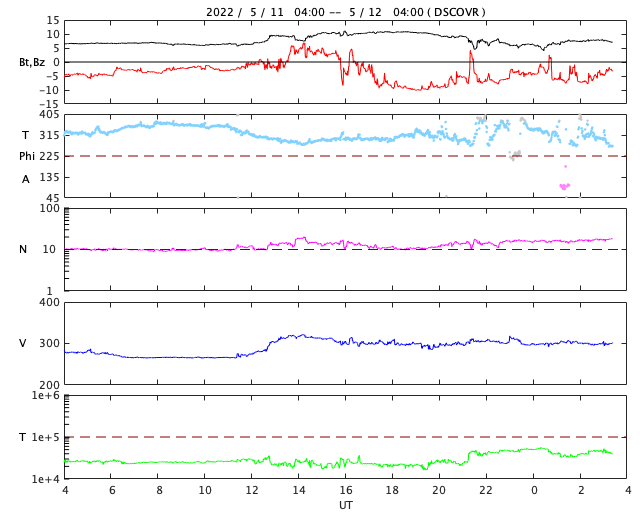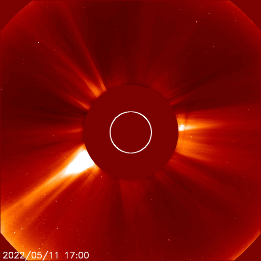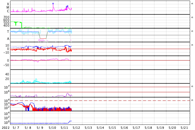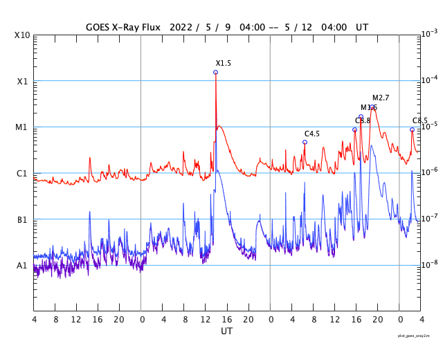 2022/ 5/12 12:31 更新 中規模フレアが3回発生し、太陽の東端から活動的な領域が近づいています。 担当 篠原 昨夜から太陽でフレアの発生が増えていて、 GOES衛星のX線グラフは変化が重なるように続いています。 その中で、今日未明、12日1時半(世界時11日16時半)に 太陽の中心部南東側(左下)の3007黒点群でM1.6、 12日3時(世界時11日18時)に西の端の向こう側(右端)でM2.6、 直後の12日4時半(世界時11日19時半)にM2.2と、 中規模フレアが3回発生しています。 フレアの様子をSDO衛星AIA131の動画で紹介します。 拡大写真は、3007群と西の端の2つの領域を表示しています。 太陽全体の動画を見ると、 この他にも東端(左端)でフレアが発生していて、 C7.6、C8.4という規模に達しています。 これらは、太陽の向こう側で発生した様に見えるので、 本当の規模はこれよりも大きかった可能性があります。 3007群とともに、これから現れる新しい領域に注目してください。 SOHO衛星LASCO C2、C3を見ると、 西の端と東の端で発生したフレアに伴って、 CME(コロナ質量放出)が右方向、左方向それぞれに噴出しています。 また、はっきりとは分かりませんが、 3007群で発生したフレアでもCMEが飛び出しているかもしれません。 その場合は、太陽風の乱れが地球へ到来する可能性があります。 現在の太陽風は、 速度が270km/秒から300km/秒へ少し上がっていますが、 低速の状態は続いています。 磁場強度は、7nTからグラフの途中で10nTに強まり、 現在は7nT前後で推移しています。 速度や密度も同じ頃に少し上昇しているので、 CMEによる弱い乱れが到来しているのかもしれません。 磁場の南北成分は南向きに振れるようになっていて、 -5 〜 -10nTと少し強まっています。 速度がだいぶ下がっているので、 磁気圏への影響は大きくはならず、 AE指数では500nTに達する程度の変化が発生しています。 SDO衛星AIA193では、 北東(左上)のコロナホールが目立っています。 明後日くらいに中心線に達して、その3日後、 17日くらいに影響が到来する可能性があります。