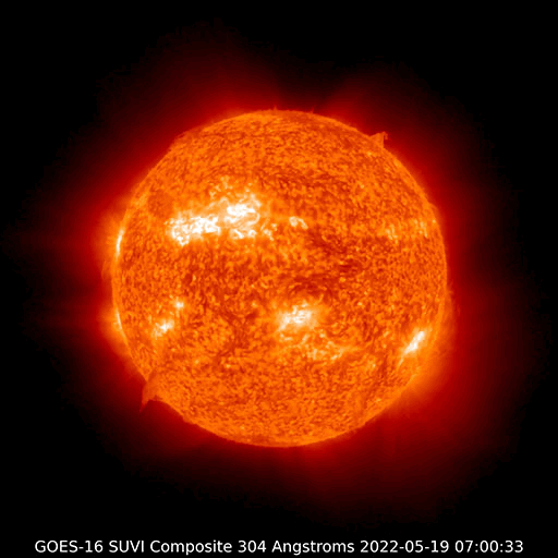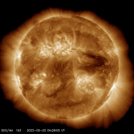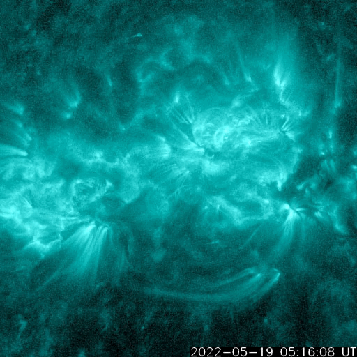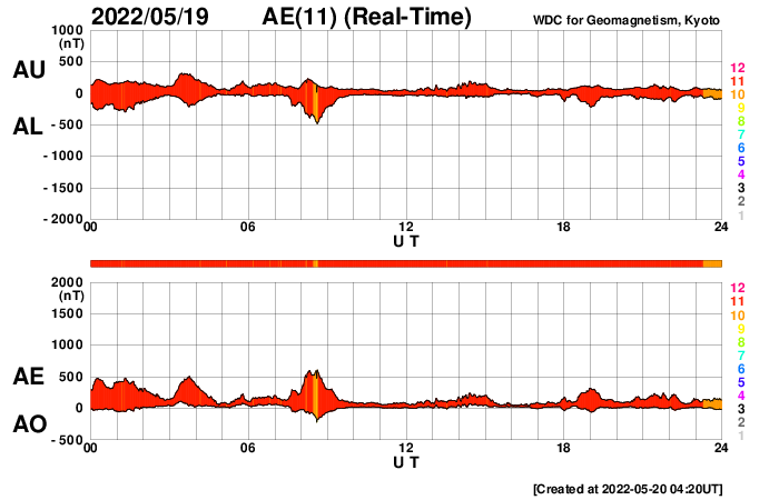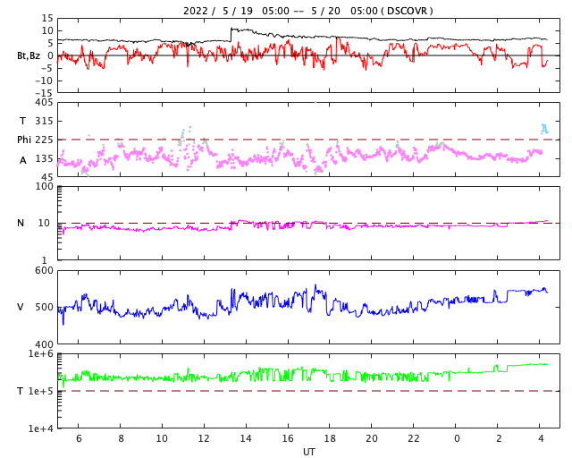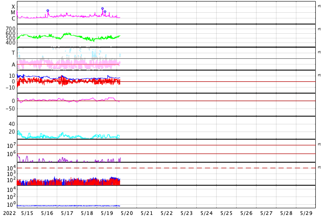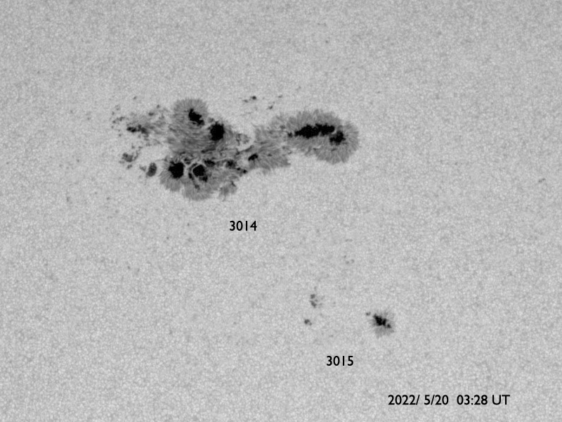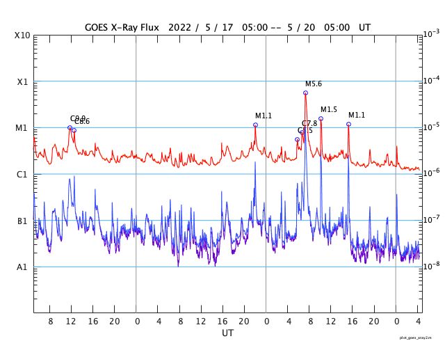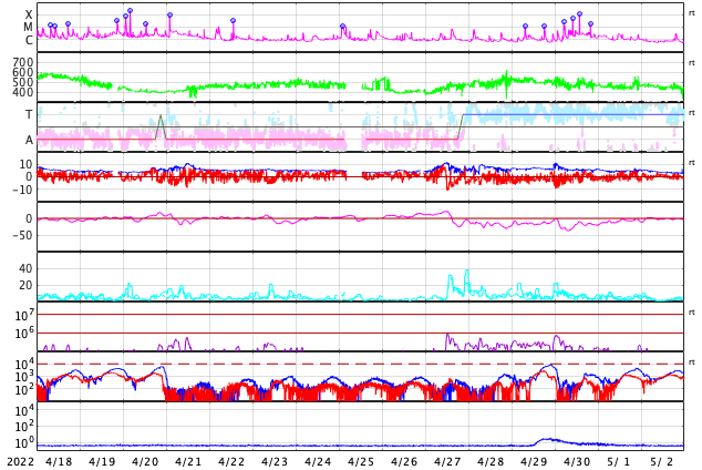 2022/ 5/20 13:40 更新 Mクラスのフレアが3回発生しました。太陽風は高速に戻っています。 担当 篠原 昨夕、19日16時(世界時19日7時)に、 太陽の中心部北東側(左上)の3017黒点群でM5.6、 続いて、右横の3014群で 19日19時(世界時19日10時)にM1.5、 20日0時(世界時19日15時)にM1.1と、 Mクラスの中規模フレアが3回連続で発生しました。 SDO衛星AIA131の動画を掲載します。 最初のM5.6は広がりも大きく、目立っています。 しかし、SOHO衛星LASCO C2の画像では、 CME(コロナ質量放出)は見えていない様です。 3014群では、その後も小さい活動が続いています。 黒点も大きな姿を保っています。 引き続き注目してください。 太陽では、昨夕から夜にかけて南半球の東西で、 プロミネンスの噴出が発生しています。 GOES衛星SUVI 304の動画を掲載します。 左下のプロミネンスはループを描く様に、 右下はまっすぐ打ち上げるような噴出になっています。 連日見事な現象が見えています。 地球に対しては横方向なので、影響はありません。 太陽風は、500km/秒から550km/秒へ速度が上がり、 再び高速の状態になっています。 コロナホールの影響は続いている様です。 磁場強度は、5nTから途中で急に10nTに上がり、 現在は少し下がって7nTです。 磁気圏は比較的穏やかな状態で、 AE指数は200nTくらいの小さい変化が見られる程度です。 SDO衛星AIA193を見ると、 コロナホールは西に通り過ぎています。 太陽風の速度はこの後下がって行きそうです。 ![]() 3017、3014黒点群で発生した、M5.6、M1.5、M1.1のフレア。SDO衛星AIA131。 (c) SDO (NASA)、(動画加工 : 宇宙天気ニュース) ![]() 3014黒点群の拡大写真。SDO衛星。 (c) SDO (NASA)、作図:宇宙天気ニュース ![]() 太陽の南側で発生した2つのプロミネンス噴出。GOES衛星SUVI 304。 (c) GOES (NOAA)、(動画加工 : 宇宙天気ニュース) ![]() SDO衛星のAIA193カメラによる太陽コロナの様子 (c) SDO (NASA) ![]() SDO衛星による太陽の可視光写真。マウスの矢印を写真に重ねると、黒点番号付きの写真に切り替わります。 (c) SDO (NASA) ![]() GOES衛星の太陽X線強度。赤・橙 = 0.1〜0.8 nm、青・紫 = 0.05〜0.4 nm (c) データ:NOAA/SWPC、作図:宇宙天気ニュース ![]() DSCOVRが観測した太陽風の磁場(黒線は全体の強度、赤線は南北成分) 磁場の向き、プラズマの密度、速度、温度 (c) データ:NOAA/SWPC、作図:宇宙天気ニュース ![]() AE指数(速報値) 下段のAEグラフの値が高くなると、オーロラ活動が活発化しています。 (c) 京都大学WDC ![]() ![]() 27日の太陽周期に合わせた図 太陽が同じ面を地球に向けていた27日前の変化から、今後を予想することができます。 (c) 作図:宇宙天気ニュース