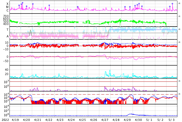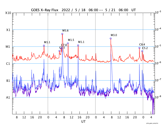 GOES衛星の太陽X線強度。赤・橙 = 0.1〜0.8 nm、青・紫 = 0.05〜0.4 nm (c) データ:NOAA/SWPC、作図:宇宙天気ニュース ![]() | ||||||||||||||||||||||||||||||||||||||||||||||||||||||||||||||||||||||||||||||||||||||||||||||||||||||||||||||||||||||||||||||||||||||||||||||||||||||||||||||||||||||||||||||||||||||||||||||||||||||||||||||||||||||||||||||||||||||||||||||||||||||||||||||||||||||||||||||||||