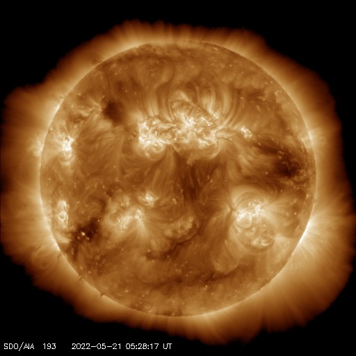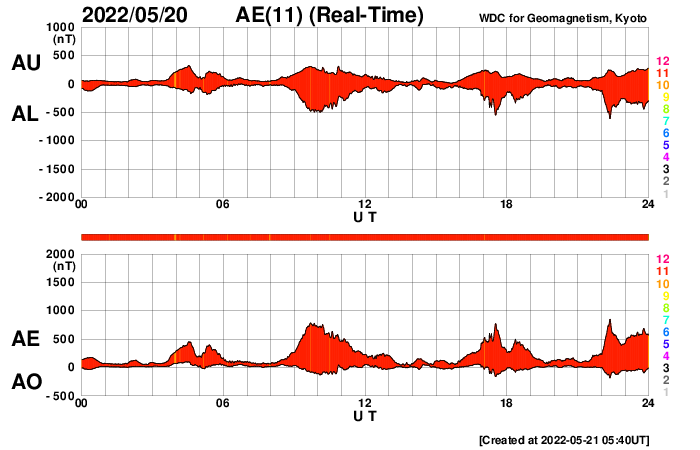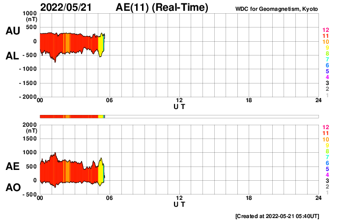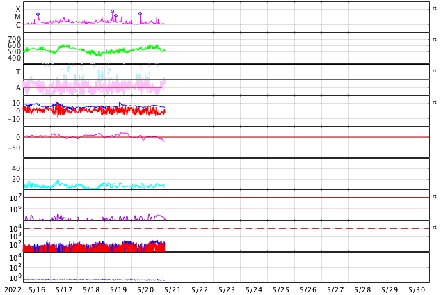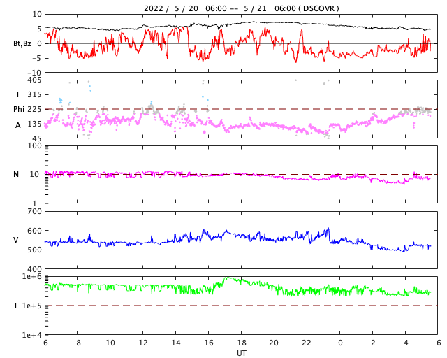 2022/ 5/21 14:41 更新 高速の太陽風が続いています。磁気圏も活動的です。 担当 篠原 昨日のニュース以降、 太陽風の速度は550km/秒前後で推移していましたが、 今朝くらいから少し下がり、現在は500km/秒付近です。 高速の状態は続いていますが、 終わりが近づいてきたのでしょうか。 太陽風の磁場強度は、5nTと平均的な状態です。 南北成分は南向きの変化が目立っています。 速度が高まっているため、磁気圏の活動は高まって、 AE指数では800nT程度の中規模の変化が繰り返し発生しています。 SDO衛星AIA193を見ると、 太陽の中心部にはコロナホールは見られず、 太陽風は一旦穏やかになりそうです。 南東側(左下)に広いコロナホールがある様なので、 次の太陽風速度の高まりはこの領域の影響になりそうです。 太陽では、20日16時半(世界時20日7時半)に 中心部北側(上側)の3014黒点群でM3.0の中規模フレア、 21日7時(世界時20日22時)に 東側(左側)の3019群でC8.4の小規模フレアなど、 あちこちでぽつぽつと活動が発生しています。 3014群付近では小さい活動が続いています。 この後のフレアはどうなるでしょうか。