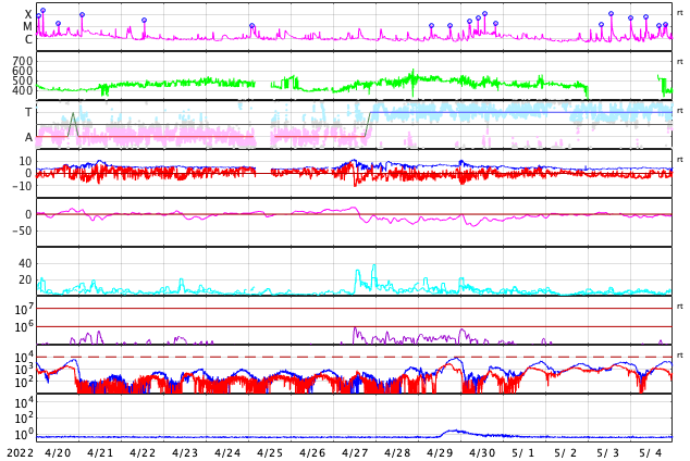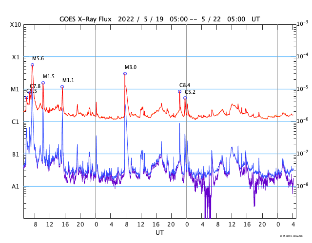 GOES衛星の太陽X線強度。赤・橙 = 0.1〜0.8 nm、青・紫 = 0.05〜0.4 nm (c) データ:NOAA/SWPC、作図:宇宙天気ニュース ![]() | ||||||||||||||||||||||||||||||||||||||||||||||||||||||||||||||||||||||||||||||||||||||||||||||||||||||||||||||||||||||||||||||||||||||||||||||||||||||||||||||||||||||||||||||||||||||||||||||||||||||||||||||||||||||||||||||||||||||||||||||||||||||||||