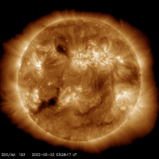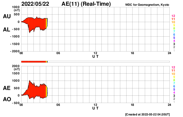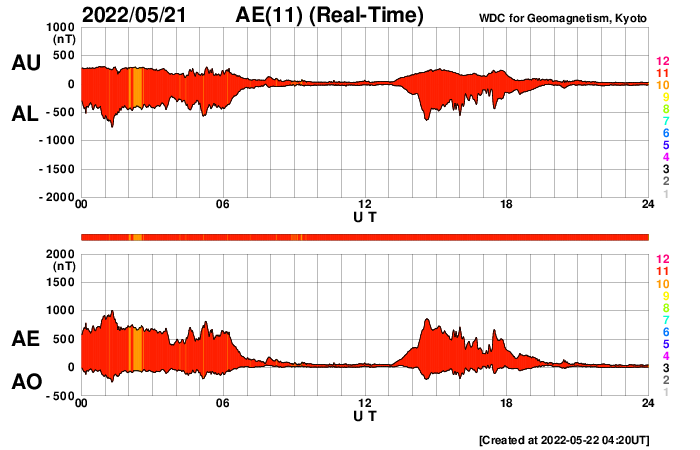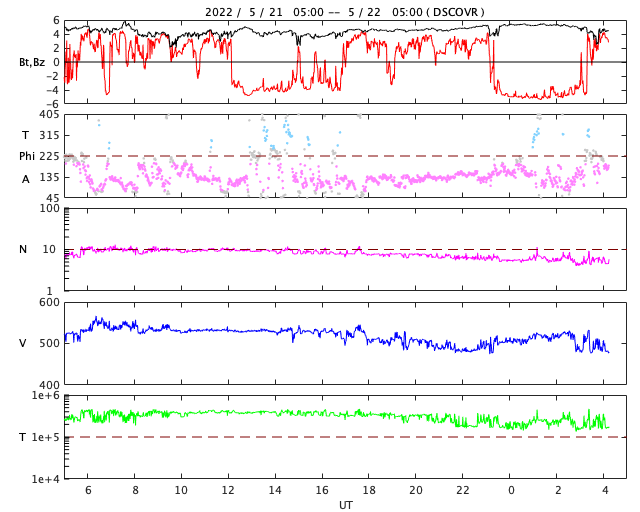 2022/ 5/22 13:22 更新 太陽風は高速の状態が続いています。太陽は落ち着いています。 担当 篠原 太陽風は、高速の状態が続いています。 昨日のニュースの後に速度は再び550km/秒へ高まりましたが、 グラフの後半では500km/秒前後に少し下がっています。 磁場強度は5nTと平均的な状態です。 磁場の南北成分は、北を向いたり、南を向いたり、 はっきりした変化の仕方をしています。 グラフでは大きく見えますが、 5nTくらいの振れ幅なので、特に大きな変化ではありません。 (27日周期の図のグラフを見ると分かりやすいです) AE指数は、磁場が南を向いた時間帯に 500〜1000nTの中規模の変化が発生しています。 SDO衛星AIA193の太陽コロナ写真では、 南東側(左下)のコロナホールがはっきり見える様になっています。 2日後くらいに中心線に達して、 その3日後くらいから太陽風の強まりが見られそうです。 太陽はC1〜3の小規模フレアが5回発生した程度で、 活動が静かになっています。 STEREO Ahead衛星によると、 東端のすぐ向こう側には特に活動的な領域はなく、 太陽はしばらく穏やかに推移するかもしれません。