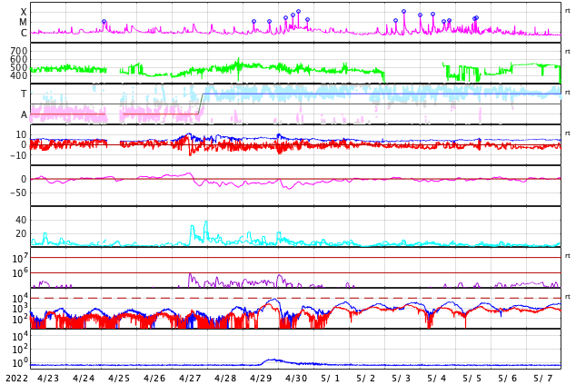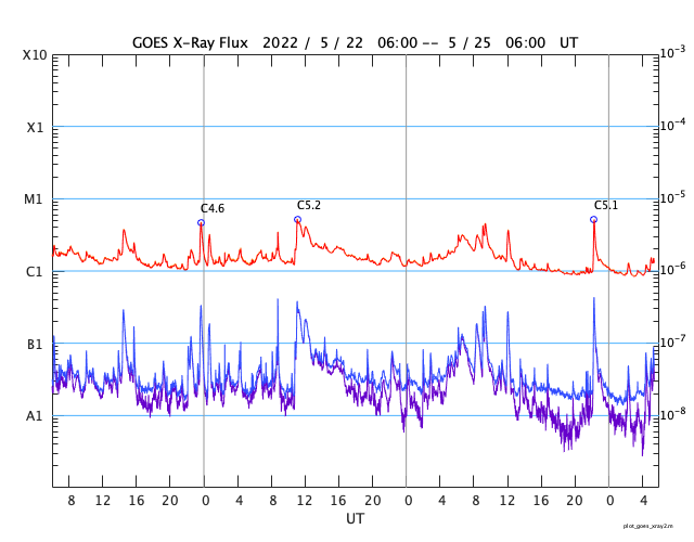 GOES衛星の太陽X線強度。赤・橙 = 0.1〜0.8 nm、青・紫 = 0.05〜0.4 nm (c) データ:NOAA/SWPC、作図:宇宙天気ニュース ![]() | ||||||||||||||||||||||||||||||||||||||||||||||||||||||||||||||||||||||||||||||||||||||||||||||||||||||||||||||||||||||||||||||||||||||||||||||||||||||||||||||||||||||||||||||||||||||||||||||||||||||||||||||||||||||||||||||||||||||||||||||||||||||||||