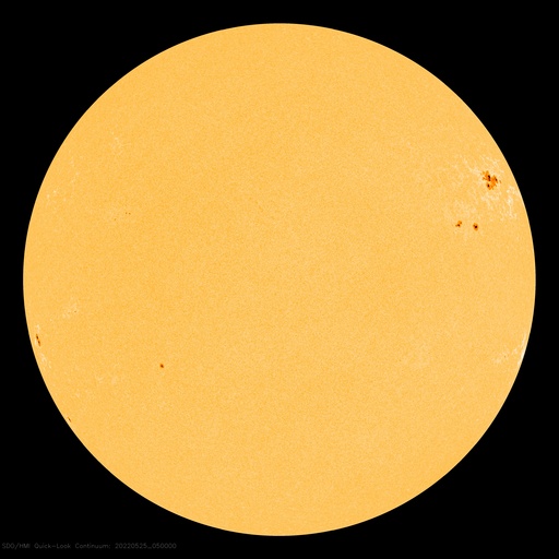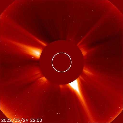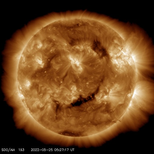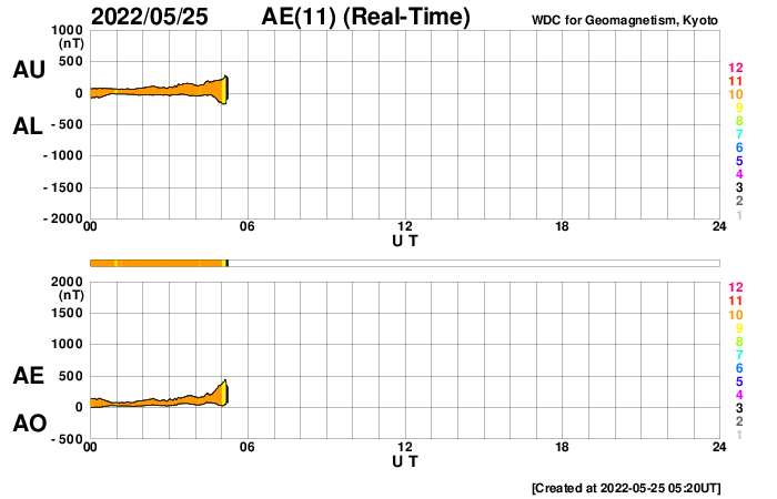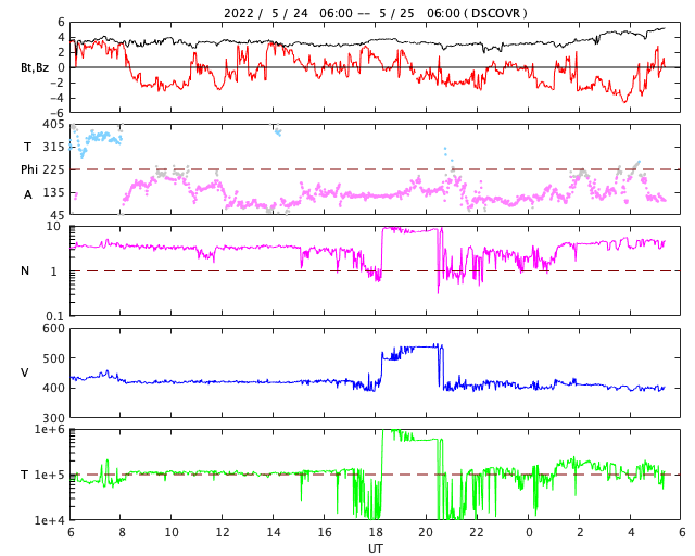 2022/ 5/25 14:38 更新 太陽風は平均的な速度です。太陽の向こう側で活動が発生しています。 担当 篠原 太陽風は、400km/秒前後の平均的な速度が続いています。 磁場強度は、3nTとやや弱くなっていましたが、 グラフの最後で5nTに少し上がっています。 SDO衛星AIA193では、南北のコロナホールが西に進み、 影響が始まる目安の位置に近付いています。 明日くらいから速度の高まりが始まるかもしれません。 太陽風の変化に注目してください。 現在の磁気圏は穏やかです。 AE指数は小さい変化が見られる程度です。 太陽は、昨夕に、北西(右上)の3011群と3017群で、 C4.2とC4.5の小規模フレア、 今朝、南東の端(左下)の新しい黒点で、 C5.1の小規模フレアが発生しています。 太陽の南東の端では、 低緯度域と中緯度域の2か所に黒点が現れています。 そして、今朝、25日8時(世界時24日23時)頃に、 東端(左端)の向こう側である程度規模の大きいフレアが発生した様で、 GOES衛星SUVI 304で、 プロミネンスが噴き上がる様子が観測されています。 そして、SOHO衛星LASCO C2では、 CME(コロナ質量放出)が飛び出し始めています。 STEREO Ahead衛星から見える太陽面よりも 更に向こう側にある領域の様です。 こちら側へ現れる頃は、活動度はどうなっているでしょうか。 ![]() 太陽の東端の向こう側の活動によるプロミネンスの噴出。GOES衛星SUVI 304。 (c) GOES (NOAA)、(動画加工 : 宇宙天気ニュース) ![]() 太陽の向こう側で発生したCMEの噴出。SOHO衛星LASCO C2。 (c) SOHO (ESA & NASA)、 (動画加工 : 宇宙天気ニュース) ![]() SDO衛星のAIA193カメラによる太陽コロナの様子 (c) SDO (NASA) ![]() SDO衛星による太陽の可視光写真。マウスの矢印を写真に重ねると、黒点番号付きの写真に切り替わります。 (c) SDO (NASA) ![]() DSCOVRが観測した太陽風の磁場(黒線は全体の強度、赤線は南北成分) 磁場の向き、プラズマの密度、速度、温度 (c) データ:NOAA/SWPC、作図:宇宙天気ニュース ![]() AE指数(速報値) 下段のAEグラフの値が高くなると、オーロラ活動が活発化しています。 (c) 京都大学WDC ![]() ![]() 27日の太陽周期に合わせた図 太陽が同じ面を地球に向けていた27日前の変化から、今後を予想することができます。 (c) 作図:宇宙天気ニュース