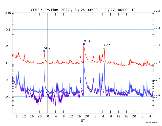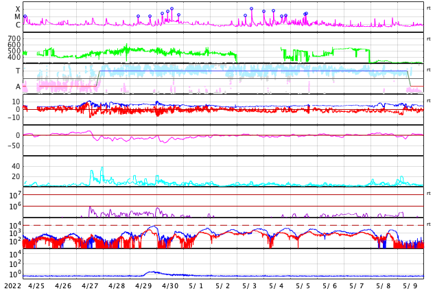 GOES衛星の太陽X線強度。赤・橙 = 0.1〜0.8 nm、青・紫 = 0.05〜0.4 nm (c) データ:NOAA/SWPC、作図:宇宙天気ニュース ![]() | ||||||||||||||||||||||||||||||||||||||||||||||||||||||||||||||||||||||||||||||||||||||||||||||||||||||||||||||||||||||||||||||||||||||||||||||||||||||||||||||||||||||||||||||||||||||||||||||||||||||||||||||||||||||||||||||||||||||||||||||||||||||||||