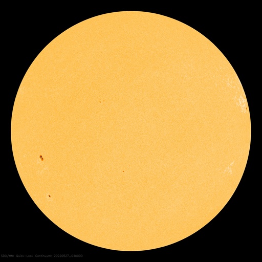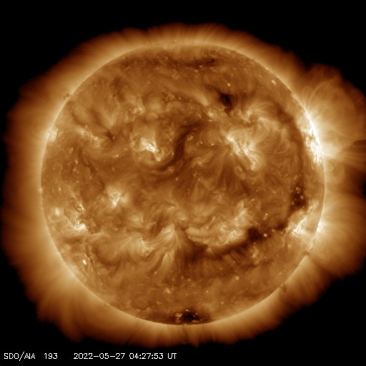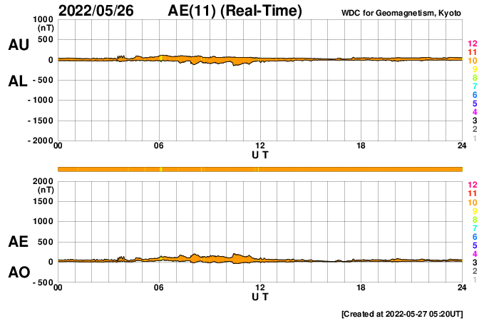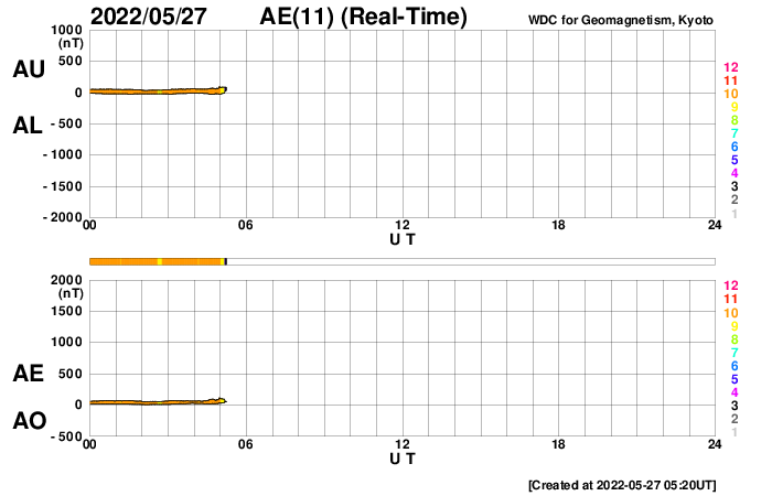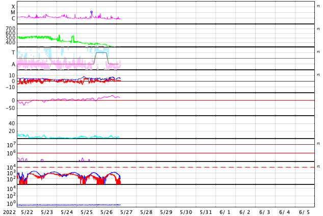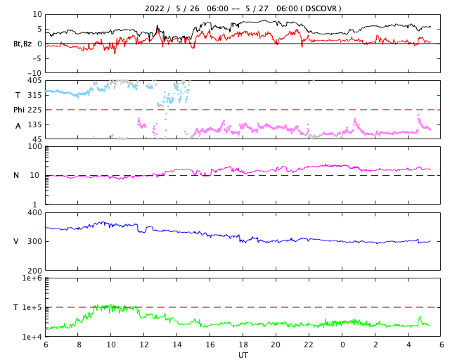 2022/ 5/27 14:36 更新 太陽風は300km/秒とさらに低速になっています。 担当 篠原 太陽風の速度は、300km/秒へ下がり、 更に低速になっています。 磁場強度は、3〜7nTの間を上下していますが、 全体としては平均的な値です。 磁気圏は静穏で、 AE指数はほとんど変化のない状態です。 コロナホールによる影響は見られないまま推移しています。 SDO衛星AIA193では、 コロナホールはだいぶ西に進んでいて、 このまま穏やかな太陽風が続くのでしょうか。 現在の太陽コロナ写真でも、 太陽の中心部の南北にかけて細長くコロナホールが伸びているので、 この後もしばらく太陽風の変化に注目して下さい。 太陽は、昨日の昼、26日13時半(世界時26日4時半)に、 北西(右上)の3017黒点群でC7.2と 大きめの小規模フレアが発生しましたが、 以降はC1〜2の小さい小規模フレアが見られる程度です。 今のところ、東側に活動的な境域はなく、 太陽はしばらく穏やかに推移しそうです。