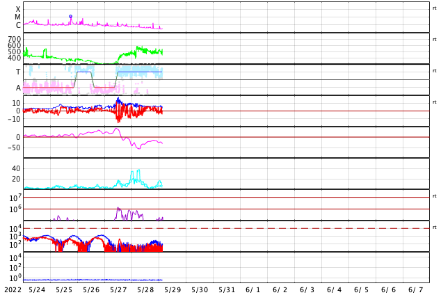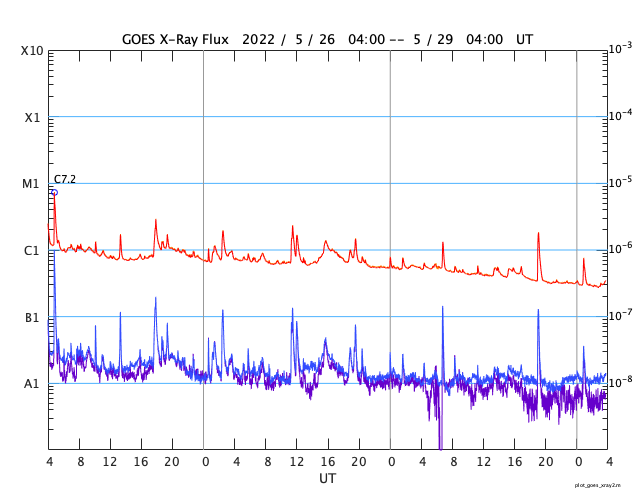 GOES衛星の太陽X線強度。赤・橙 = 0.1〜0.8 nm、青・紫 = 0.05〜0.4 nm (c) データ:NOAA/SWPC、作図:宇宙天気ニュース ![]() | ||||||||||||||||||||||||||||||||||||||||||||||||||||||||||||||||||||||||||||||||||||||||||||||||||||||||||||||||||||||||||||||||||||||||||||||||||||||||||||||||||||||||||||||||||||||||||||||||||||||||||||||||||||||||||||