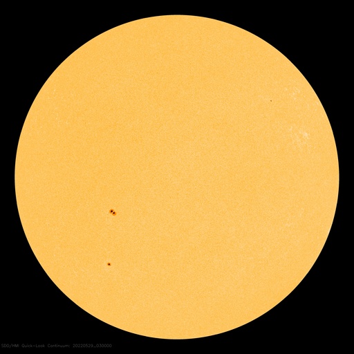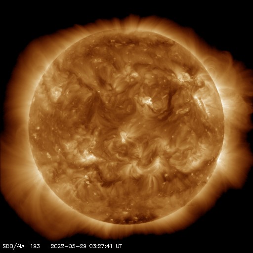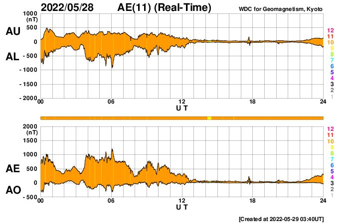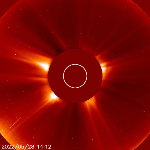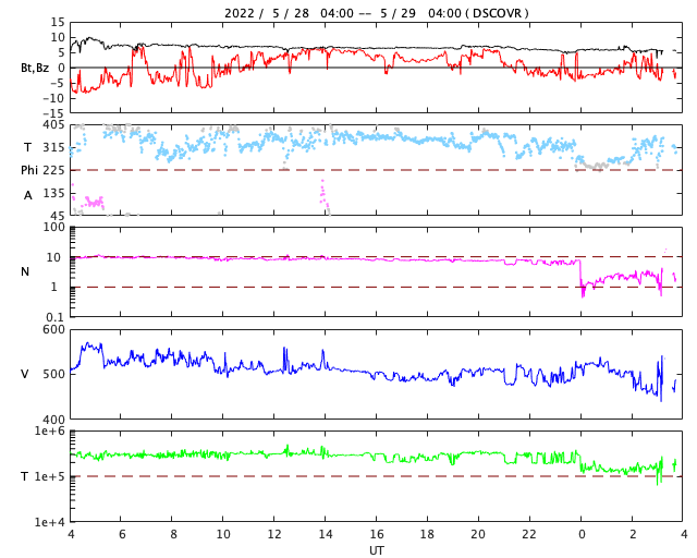 2022/ 5/29 12:52 更新 太陽風の速度は下がり始めています。太陽の向こう側でCMEが発生しています。 担当 篠原 太陽風は、昨日のニュースの後に550km/秒くらいまで速度が高まり、 その後は次第に低下して、 現在は470km/秒程度と、やや高速くらいになっています。 磁場強度は、6nTと平均的な状態です。 磁場の南北成分は、グラフの途中から北寄りに傾向が変わり、 後半では0nTを挟んで南北に変化しています。 磁気圏の活動はこれに対応していて、 AE指数は、1枚目のグラフの途中から変化がなくなり、 2枚目に入ると小規模の変化が起きるようになっています。 SDO衛星AIA193では、コロナホールは見えなくなっていて、 この後、太陽風の速度は次第に下がりそうです。 太陽は、中心部の3021群の領域(黒点は見えなくなっています)で C1.8の小規模フレアが発生した程度で、穏やかです。 ただ、裏側では活動が発生している様で、 深夜、29日0時(世界時28日15時)頃に、 SOHO衛星LASCO C2、C3で、 CME(コロナ質量放出)の噴出が観測されています。 ![]() 太陽の向こう側で発生したCME。SOHO衛星LASCO C2、C3。 (c) SOHO (ESA & NASA)、 (動画加工 : 宇宙天気ニュース) ![]() SDO衛星のAIA193カメラによる太陽コロナの様子 (c) SDO (NASA) ![]() SDO衛星による太陽の可視光写真。マウスの矢印を写真に重ねると、黒点番号付きの写真に切り替わります。 (c) SDO (NASA) ![]() DSCOVRが観測した太陽風の磁場(黒線は全体の強度、赤線は南北成分) 磁場の向き、プラズマの密度、速度、温度 (c) データ:NOAA/SWPC、作図:宇宙天気ニュース ![]() AE指数(速報値) 下段のAEグラフの値が高くなると、オーロラ活動が活発化しています。 (c) 京都大学WDC ![]() ![]() 27日の太陽周期に合わせた図 太陽が同じ面を地球に向けていた27日前の変化から、今後を予想することができます。 (c) 作図:宇宙天気ニュース