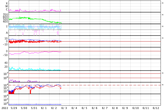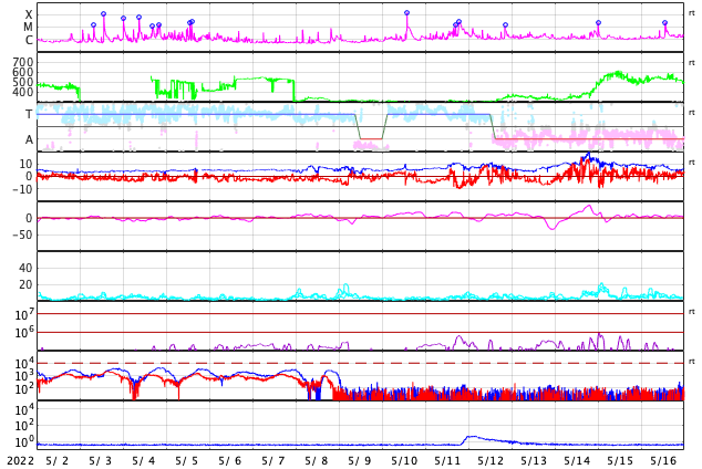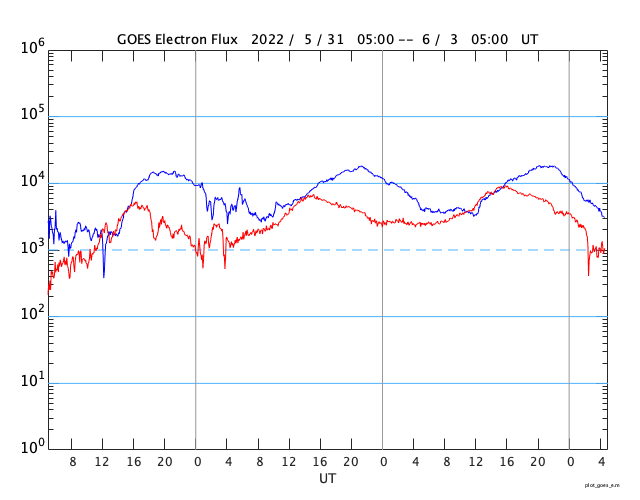 GOES衛星による、静止衛星軌道における高エネルギー電子 ( 2 MeV 以上 ) の変化 (c) データ:NOAA/SWPC、作図:宇宙天気ニュース ![]() | ||||||||||||||||||||||||||||||||||||||||||||||||||||||||||||||||||||||||||||||||||||||||||||||||||||||||||||||||||||||||||||||||||||||||||||||||||||||||||||||||||||||||||||||||||||||||||||||||||||||||||||||||||||||||||