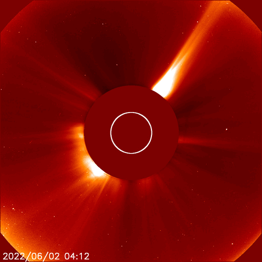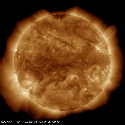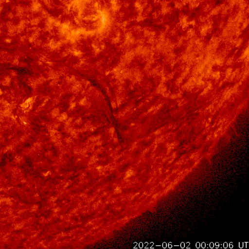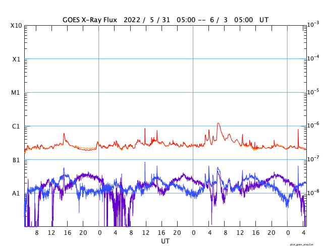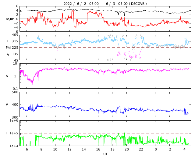 2022/ 6/ 3 13:55 更新 太陽の南西側でフィラメント噴出が発生しました。太陽風は低速です。 担当 篠原 昨日、2日14時(世界時2日5時)頃に、 太陽の南西側(右下)で、フィラメント噴出が発生しました。 SDO衛星AIA304の動画を掲載します。 噴出したダークフィラメントは、 昨日のニュースの頃に不安定な動きが見えたので、 個人的に注目していたのですが、 その直後に噴出していました。 SOHO衛星LASCO C2、C3では、 太陽の右側に飛び出すCME(コロナ質量放出)が観測されています。 斜め方向ですが、弱い太陽風の乱れが到来するかもしれません。 磁場の強まりがやって来て、南向きに変化すると、 磁気圏の活動を強める可能性があります。 到来まで4〜5日程度と考えると、6〜7日頃でしょうか。 また、ほぼ同じ時刻に、 太陽の東端(左端)の少し向こう側でも爆発現象が発生していて、 X線グラフでは、C1.2の小規模フレアとして観測されています。 この活動により、LASCO C2、C3では、 CMEが太陽の左に向かって飛び出す様子も見えています。 太陽では、この他に目立つ活動はなく、 X線グラフは小さい変化しか起きていません。 太陽風は、速度が350km/秒へ下がり、 更に低速になっています。 磁場強度は、3〜4nTとやや弱い状態です。 磁場の南北成分は、弱い南寄りになっていますが、 速度が下がっているので、磁気圏は基本的に穏やかで、 AE指数は小さい変化に留まっています。 SDO衛星AIA193では、コロナホールは見られず、 低速の太陽風はしばらく続きそうです。 放射線帯の高エネルギー電子は、 高まった状態が続いています。 この後、ゆっくりと減少していくでしょう。 ![]() 太陽の南西側で発生したフィラメント噴出。SDO衛星AIA304。 (c) SDO (NASA)、(動画加工 : 宇宙天気ニュース) ![]() 太陽の右側へ飛び出すCME。SOHO衛星LASCO C2、C3。 (c) SOHO (ESA & NASA)、 (動画加工 : 宇宙天気ニュース) ![]() SDO衛星のAIA193カメラによる太陽コロナの様子 (c) SDO (NASA) ![]() SDO衛星による太陽の可視光写真。マウスの矢印を写真に重ねると、黒点番号付きの写真に切り替わります。 (c) SDO (NASA) ![]() GOES衛星の太陽X線強度。赤・橙 = 0.1〜0.8 nm、青・紫 = 0.05〜0.4 nm (c) データ:NOAA/SWPC、作図:宇宙天気ニュース ![]() DSCOVRが観測した太陽風の磁場(黒線は全体の強度、赤線は南北成分) 磁場の向き、プラズマの密度、速度、温度 (c) データ:NOAA/SWPC、作図:宇宙天気ニュース ![]() AE指数(速報値) 下段のAEグラフの値が高くなると、オーロラ活動が活発化しています。 (c) 京都大学WDC ![]() ![]() 27日の太陽周期に合わせた図 太陽が同じ面を地球に向けていた27日前の変化から、今後を予想することができます。 (c) 作図:宇宙天気ニュース
