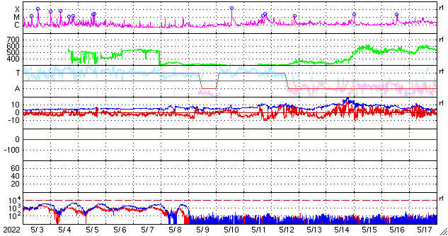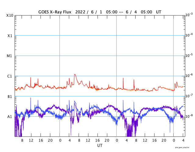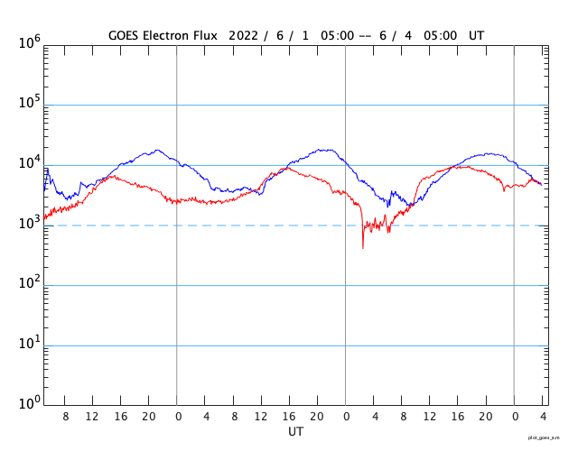 GOES衛星の太陽X線強度。赤・橙 = 0.1〜0.8 nm、青・紫 = 0.05〜0.4 nm (c) データ:NOAA/SWPC、作図:宇宙天気ニュース ![]() GOES衛星による、静止衛星軌道における高エネルギー電子 ( 2 MeV 以上 ) の変化 (c) データ:NOAA/SWPC、作図:宇宙天気ニュース ![]() | ||||||||||||||||||||||||||||||||||||||||||||||||||||||||||||||||||||||||||||||||||||||||||||||||||||||||||||||||||||||||||||||||||||||||||||||||||||||||||||||||||||||||||||||||||||||||||||||||||||||||||||||||||||||