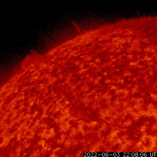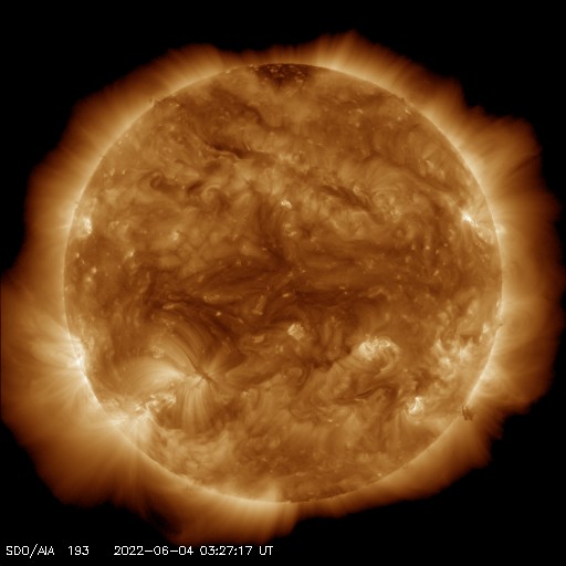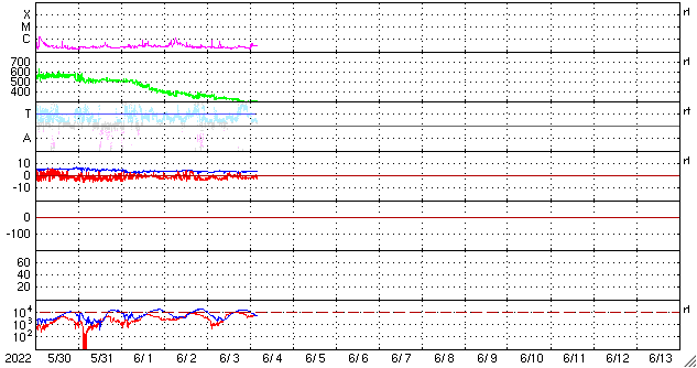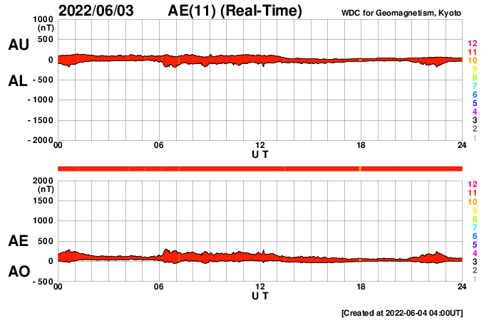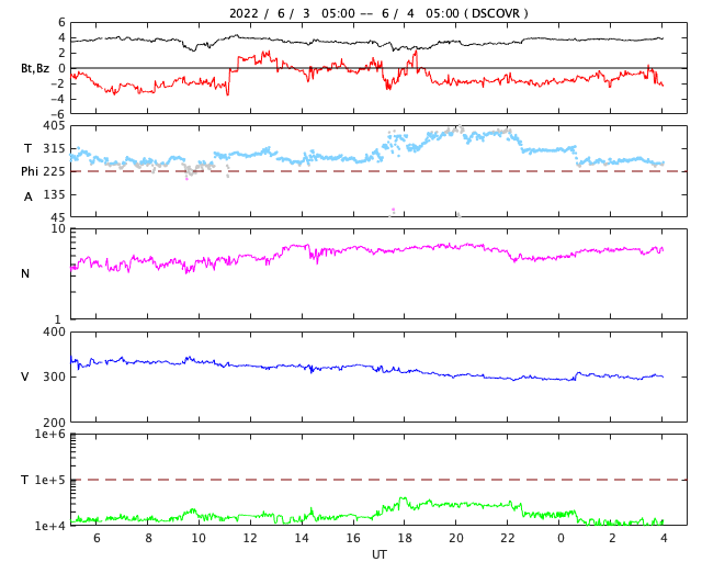 2022/ 6/ 4 13:16 更新 太陽風は更に低速になっています。磁気圏も穏やかです。 担当 篠原 太陽風の速度は、300km/秒へ下がっています。 かなり低速になってきました。 磁場強度は、3〜4nTとやや弱い状態です。 磁気圏は穏やかで、 AE指数は、ほとんど変化が見られません。 SDO衛星AIA193の太陽コロナ写真では、 太陽全体がぼんやり光っています。 CMEによる突発性の乱れがなければ、 太陽風はしばらく穏やかな状態が続きそうです。 太陽では、今日の昼、4日11時(世界時4日2時)に、 北東側(左上)でフィラメント噴出が発生しています。 SDO衛星AIA304の動画を掲載します。 まだ、発生直後なので、写真は噴き出す途中までです。 CME(コロナ質量放出)の発生は、 この後のSOHO衛星LASCO C2、C3などに注目してください。 斜め上に向かっているので、 地球への影響は、やって来ても小さい変化になりそうです。 X線グラフは、Bクラスの小さい変化が起きている程度で、 穏やかです。 太陽の東端(左端)の南北に、小さい黒点が現れています。 放射線帯の高エネルギー電子は、 高まった状態が続いています。 ![]() 太陽の北東側で発生したプロミネンス噴出。SDO衛星AIA304。 (c) SDO (NASA)、(動画加工 : 宇宙天気ニュース) ![]() SDO衛星のAIA193カメラによる太陽コロナの様子 (c) SDO (NASA) ![]() SDO衛星による太陽の可視光写真。マウスの矢印を写真に重ねると、黒点番号付きの写真に切り替わります。 (c) SDO (NASA) ![]() DSCOVRが観測した太陽風の磁場(黒線は全体の強度、赤線は南北成分) 磁場の向き、プラズマの密度、速度、温度 (c) データ:NOAA/SWPC、作図:宇宙天気ニュース ![]() AE指数(速報値) 下段のAEグラフの値が高くなると、オーロラ活動が活発化しています。 (c) 京都大学WDC ![]() ![]() 27日の太陽周期に合わせたデータプロット 太陽が同じ面を地球に向けていた27日前の変化から、今後を予想することができます。 (c) 作図:宇宙天気ニュース
