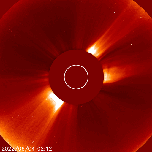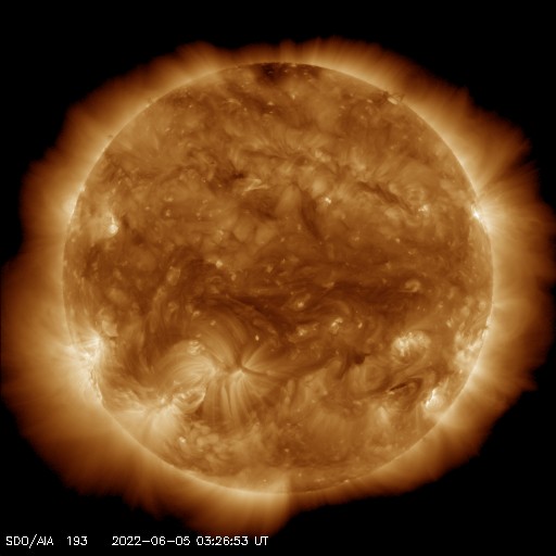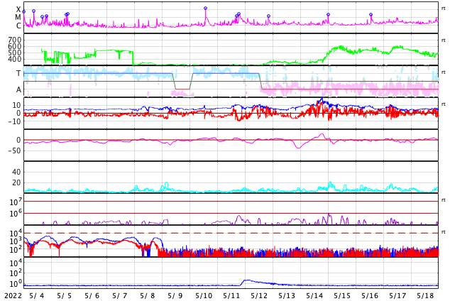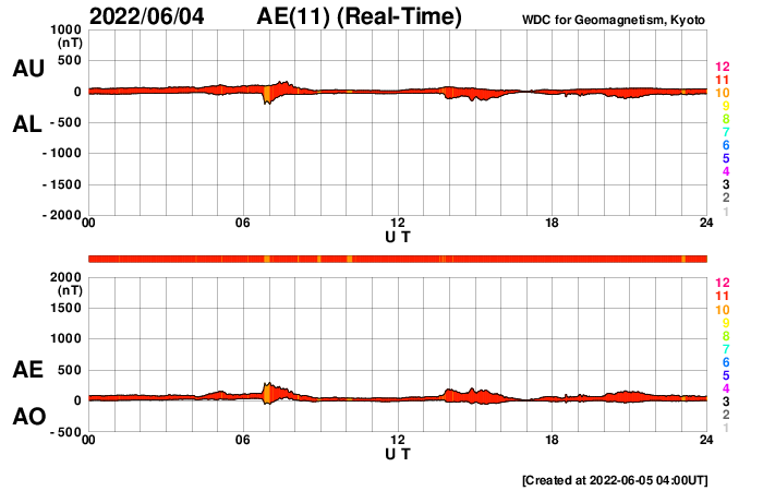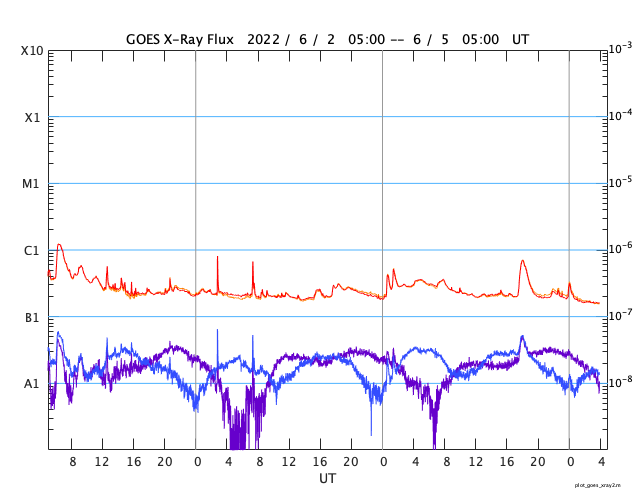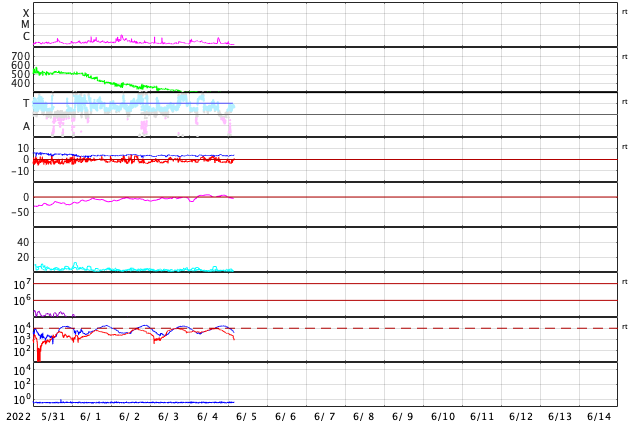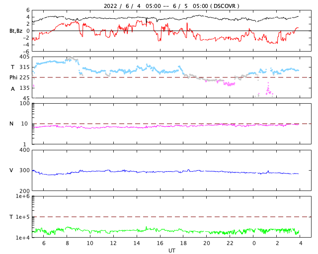 2022/ 6/ 5 13:10 更新 低速の太陽風が続いています。磁気圏も穏やかです。 担当 篠原 昨日紹介した、太陽の北東側(左上)で発生した フィラメント噴出によるCME(コロナ質量放出)を、 SOHO衛星LASCO C2、C3の動画で紹介します。 コロナのガスは、太陽から上に向かって飛び出しています。 地球への影響はなさそうです。 太陽は、南東の端(左下)に見えていた新しい黒点に、 3029黒点群と番号が付けられています。 北東端(左上)の黒点にも3028群と番号が付けられたのですが、 現在の写真ではほとんど見えなくなっています。 X線グラフは、Bクラスの小さい変化しかなく、 太陽は穏やかです。 太陽風は、290km/秒と低速の状態で推移しています。 磁場強度も、3〜4nTとやや弱い値で安定しています。 磁気圏は静穏で、AE指数はほとんど変化がありません。 SDO衛星AIA193は、太陽全体がぼんやりと光っていて、 コロナホールはありません。 太陽風は穏やかな状態が続きそうです。 放射線帯の高エネルギー電子は、高まった状態が続いています。 太陽風が穏やかになり、ゆっくりと減少しています。