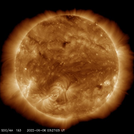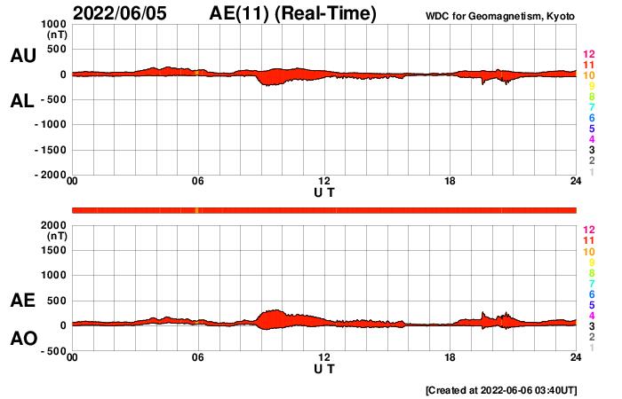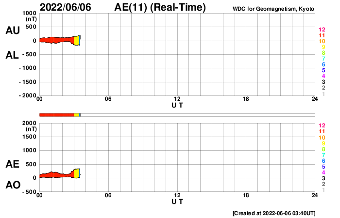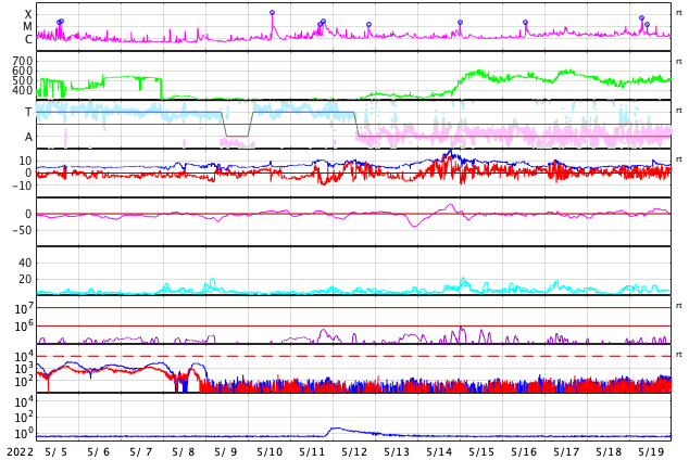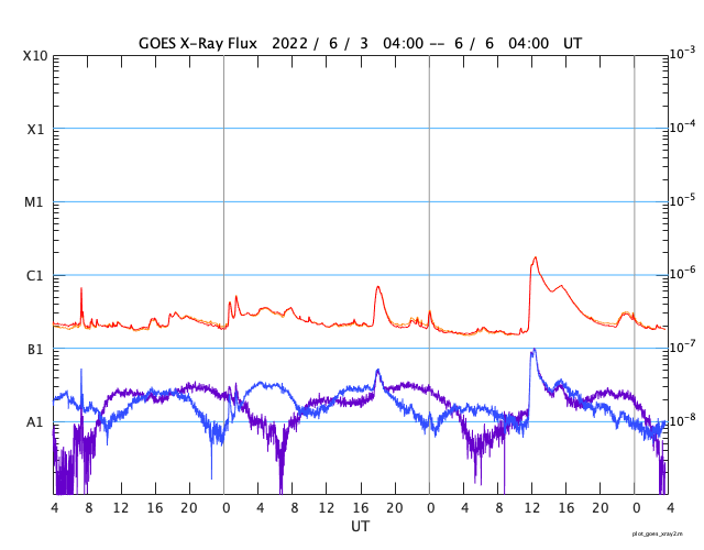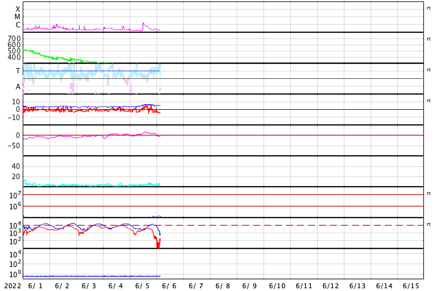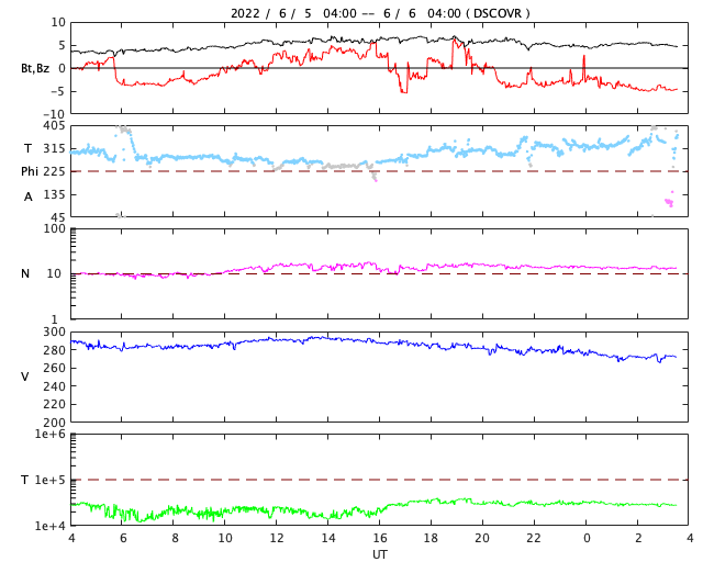 2022/ 6/ 6 12:48 更新 太陽風は、270km/秒と更に低速になっています。 担当 篠原 太陽風の速度は、また少し下がり、 270km/秒とかなり低速になっています。 磁場強度は、5〜6nTと平均的な値になっています。 磁場の南北成分は、南向きに変化していますが、 速度が下がっているため、磁気圏は基本的には穏やかで、 AE指数は、200nT前後の小さい変化が発生する程度です。 SDO衛星AIA193の太陽コロナ写真では、 コロナホールは特に見えません。 27日周期の図を見ると、 前周期は5月15日から太陽風の速度が高まっていますが、 今回はどうなるでしょうか。 回帰は11日頃になるので、もうしばらく先です。 太陽は、南東(左下)の3029黒点群の左下で、 C1.7の小規模フレアが発生しています。 X線グラフは、他が静かなのでとても目立っていますが、 規模は小さいフレアです。 黒点も、小さいものがいくつか見えている程度で、 だいぶ寂しくなっています。 小規模ですが、磁気圏活動の影響を受けて、 放射線帯の高エネルギー電子は、 減少しているかもしれません。