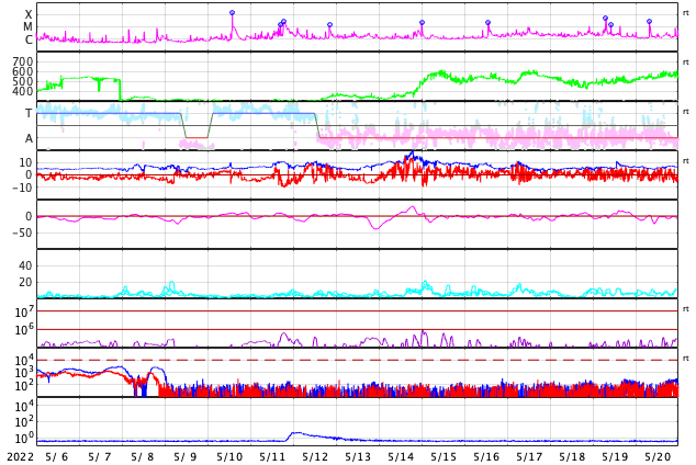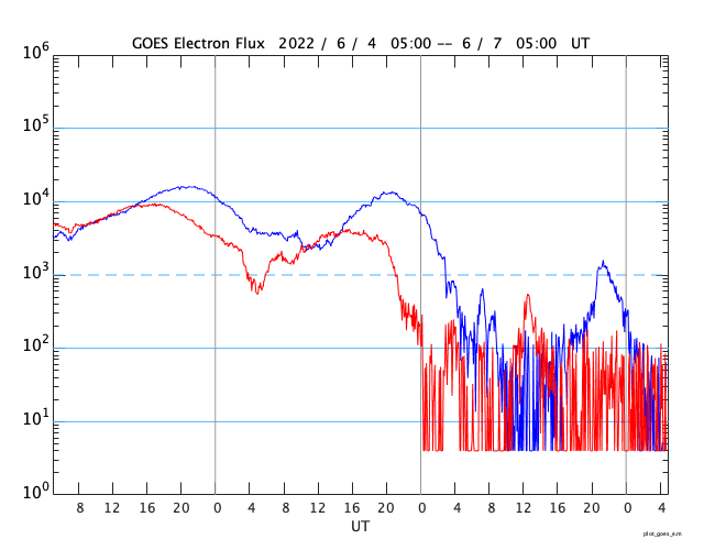 GOES衛星の太陽X線強度。赤・橙 = 0.1〜0.8 nm、青・紫 = 0.05〜0.4 nm (c) データ:NOAA/SWPC、作図:宇宙天気ニュース ![]() GOES衛星による、静止衛星軌道における高エネルギー電子 ( 2 MeV 以上 ) の変化 (c) データ:NOAA/SWPC、作図:宇宙天気ニュース ![]() | ||||||||||||||||||||||||||||||||||||||||||||||||||||||||||||||||||||||||||||||||||||||||||||||||||||||||||||||||||||||||||||||||||||||||||||||||||||||||||||||||||||||||||||||||||||||||||||||||||||||||||||||||||||||||||||