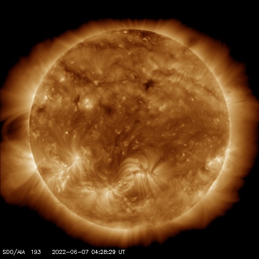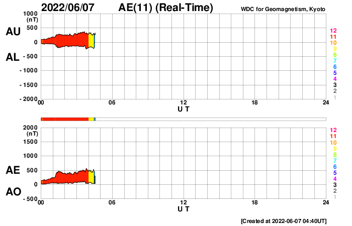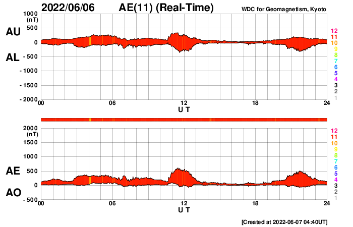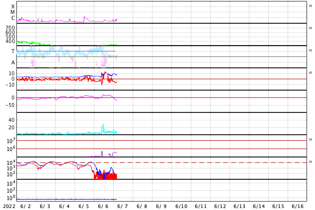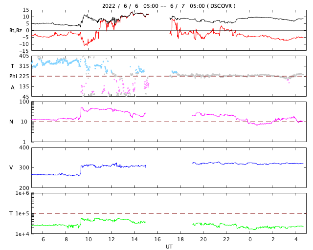 2022/ 6/ 7 13:58 更新 太陽風の小規模の乱れが到来しましたが、低速の状態は続いています。 担当 篠原 昨夕から、小規模ですが太陽風の乱れが到来しています。 DSCOVR衛星のグラフを見ると、 6日18時(世界時6日9時)に、 太陽風の速度が260km/秒から310km/秒へ、 磁場強度は3nTから11nTへ、 それぞれ急に高まっています。 3日のニュースでお知らせした、 2日14時(世界時2日5時)のフィラメント噴出による 太陽風の乱れが到来したのではないかと思います。 この場合、地球まで4日ほどかかったことになります。 太陽風磁場の南北成分は、 乱れの初めに -10nTを超えるくらいに南向きが強まりましたが、 速度が下がっているため、磁気圏への影響は小さく、 AE指数は500nTに達した程度でした。 その後、磁場は北向きに切り替わり、 今朝早くから再び南向きの状態が続いています。 しかし、現在もAE指数の変化は500nT弱と小規模です。 現在の太陽風は、速度は320km/秒、磁場強度は7nTです。 この後も、低速の状態が続きそうです。 太陽は、西の端(右端)の3023黒点群で Bクラスの小さい変化が起きている程度で、 穏やかな状態です。 黒点も昨日以上に小さく見にくくなっています。 放射線帯の高エネルギー電子は、 太陽風の乱れの到来で、大きく下がっています。