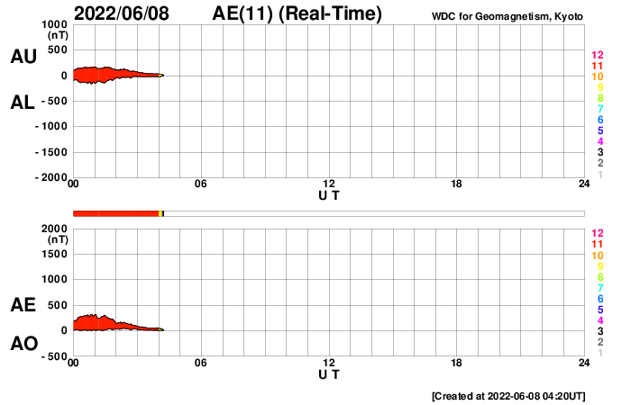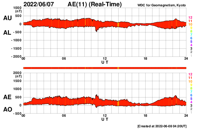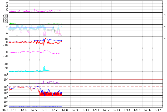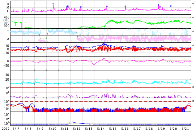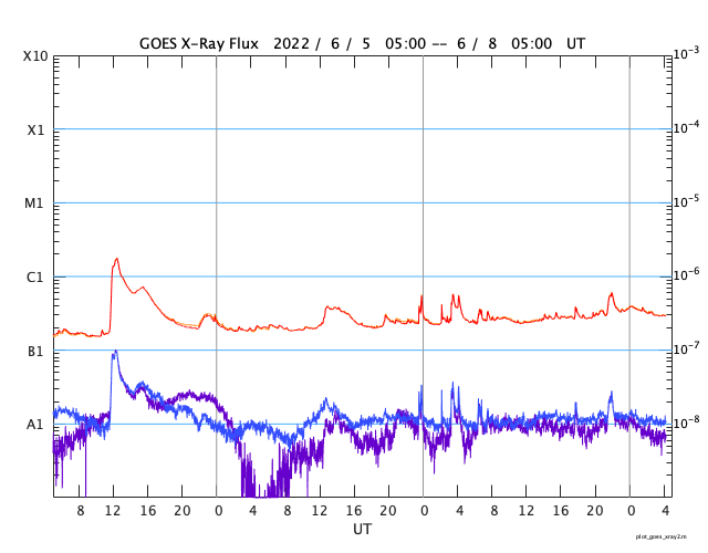 GOES衛星の太陽X線強度。赤・橙 = 0.1〜0.8 nm、青・紫 = 0.05〜0.4 nm (c) データ:NOAA/SWPC、作図:宇宙天気ニュース ![]() | ||||||||||||||||||||||||||||||||||||||||||||||||||||||||||||||||||||||||||||||||||||||||||||||||||||||||||||||||||||||||||||||||||||||||||||||||||||||||||||||||||||||||||||||||||||||||||||||||||||||||||||||||||