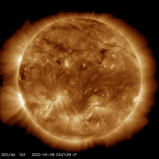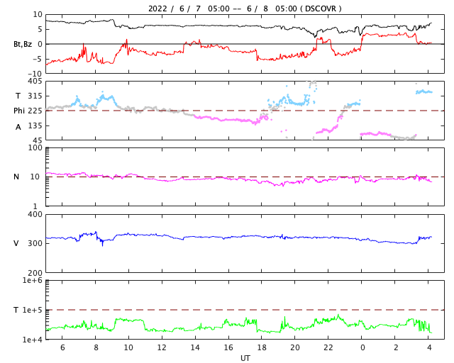 2022/ 6/ 8 13:29 更新 低速の太陽風が続いています。太陽は無黒点寸前です。 担当 篠原 太陽風は、320km/秒の低速の状態が続いています。 磁場用度は6nTと平均的な状態です。 磁場の南北成分は、今朝まで南寄りの変化が続き、 その後、北向きに変わりましたが、現在は0nT付近です。 この後はどのように推移するでしょうか。 AE指数は、磁場の南向きの影響で、 500nTくらいの変化が長く続きました。 速度が下がっていたので、 変化の規模は高まらないままでした。 現在は南向きの変化が終わっているので、 磁気圏は穏やかになるでしょう。 SDO衛星AIA193では、 東端(左端)にコロナホールが見え始めています。 この辺りまで低速の状態が続くのでしょうか。 太陽は、南西側(右下)に微かに黒点が見えているかな という状況で、無黒点に近い状態です。 X線グラフもBクラスの小さい変化がある程度で、 太陽は穏やかに推移しています。 ![]() SDO衛星のAIA193カメラによる太陽コロナの様子 (c) SDO (NASA) ![]() SDO衛星による太陽の可視光写真。マウスの矢印を写真に重ねると、黒点番号付きの写真に切り替わります。 (c) SDO (NASA) ![]() DSCOVRが観測した太陽風の磁場(黒線は全体の強度、赤線は南北成分) 磁場の向き、プラズマの密度、速度、温度 (c) データ:NOAA/SWPC、作図:宇宙天気ニュース ![]() AE指数(速報値) 下段のAEグラフの値が高くなると、オーロラ活動が活発化しています。 (c) 京都大学WDC ![]() ![]() 27日の太陽周期に合わせた図 太陽が同じ面を地球に向けていた27日前の変化から、今後を予想することができます。 (c) 作図:宇宙天気ニュース