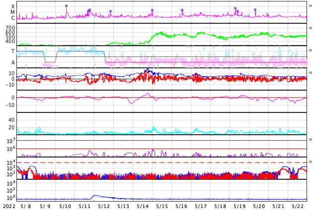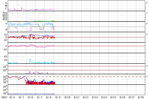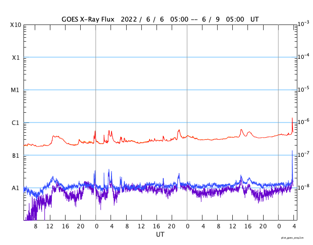 GOES衛星の太陽X線強度。赤・橙 = 0.1〜0.8 nm、青・紫 = 0.05〜0.4 nm (c) データ:NOAA/SWPC、作図:宇宙天気ニュース ![]() | ||||||||||||||||||||||||||||||||||||||||||||||||||||||||||||||||||||||||||||||||||||||||||||||||||||||||||||||||||||||||||||||||||||||||||||||||||||||||||||||||||||||||||||||||||||||||||||||||||||||||||||||