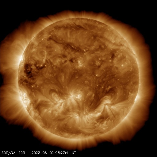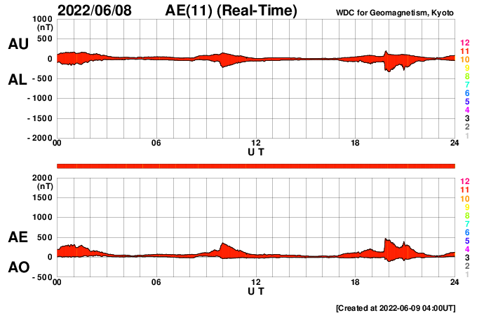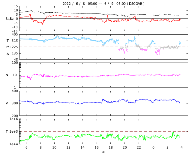2022/ 6/ 9 13:01 更新 低速の太陽風が続いています。新しい黒点が発生しています。 担当 篠原 太陽風は、320km/秒前後の低速の状態が続いています。 磁場強度は、グラフの前半で10nTに強まる変化が発生していますが、 現在は4nTと平均的な値に戻っています。 磁場の南北成分は、 グラフの前半は北寄り、後半は南寄りになっています。 AE指数は、300〜500nTの小規模の変化が時々発生していますが、 速度がだいぶ下がっているため、磁気圏は比較的穏やかです。 SDO衛星AIA193では、 太陽の東端(左端)の赤道付近にコロナホールが見えています。 次の速度の高まりは、この領域の影響になりそうです。 太陽は、中心部の南側に新しい黒点が発生しています。 この領域で、ちょうど今、C1.3の小規模フレアが発生しました。 X線グラフの右端に、この変化が見えています。 STEREO Ahead衛星によると、 北東の端(左上)の向こう側に活動的な領域がある様です。 どの様な活動度の領域が現れるでしょうか。 ![]() SDO衛星のAIA193カメラによる太陽コロナの様子 (c) SDO (NASA) ![]() SDO衛星による太陽の可視光写真。マウスの矢印を写真に重ねると、黒点番号付きの写真に切り替わります。 (c) SDO (NASA) ![]() DSCOVRが観測した太陽風の磁場(黒線は全体の強度、赤線は南北成分) 磁場の向き、プラズマの密度、速度、温度 (c) データ:NOAA/SWPC、作図:宇宙天気ニュース ![]() AE指数(速報値) 下段のAEグラフの値が高くなると、オーロラ活動が活発化しています。 (c) 京都大学WDC ![]() ![]() 27日の太陽周期に合わせた図 太陽が同じ面を地球に向けていた27日前の変化から、今後を予想することができます。 (c) 作図:宇宙天気ニュース