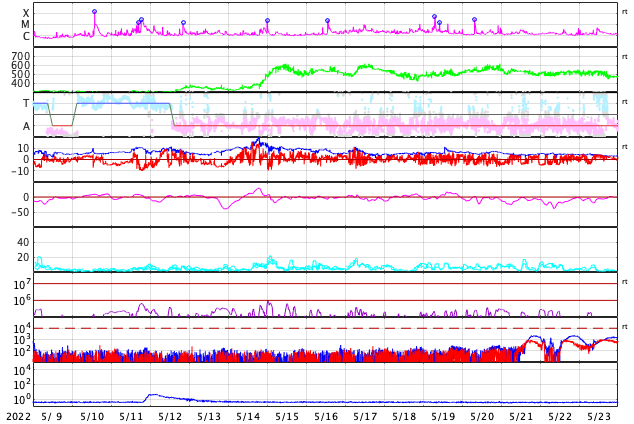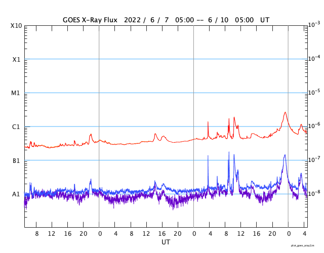 GOES衛星の太陽X線強度。赤・橙 = 0.1〜0.8 nm、青・紫 = 0.05〜0.4 nm (c) データ:NOAA/SWPC、作図:宇宙天気ニュース ![]() | |||||||||||||||||||||||||||||||||||||||||||||||||||||||||||||||||||||||||||||||||||||||||||||||||||||||||||||||||||||||||||||||||||||||||||||||||||||||||||||||||||||||||||||||||||||||||||||||||||||||||||||||||||