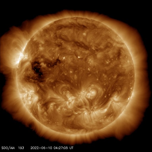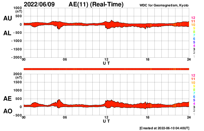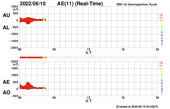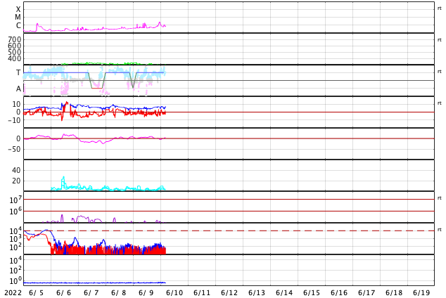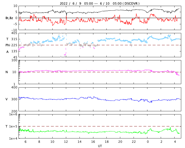 2022/ 6/10 13:52 更新 太陽風は更に低速になっています。太陽の東端の向こう側でフレアが発生しています。 担当 篠原 太陽風は、290km/秒へ速度が下がり、 より低速の状態に戻っています。 磁場強度は、5〜7nTと平均的な値ですが、 グラフでは、少し強まりかけているようにも見えます。 磁場の南北成分は、南寄りの傾向が続いています。 磁気圏は弱い活動が見られ、 AE指数は、300nT前後の変化が連続しています。 SDO衛星AIA193では、 東側(左側)の赤道域のコロナホールがよく見える様になっています。 3日くらいで中心線に達して、 その3日後くらいから太陽風速度の高まりが始まるかもしれません。 それまでは、現在の様な低速の風が続くのでしょうか。 太陽は、中心部南側の黒点は、 4〜7日頃に見えていた3029群の再出現とのことです。 また、北東の端(左上)から新しい黒点が現れています。 この北東の端の向こう側では、 昨夜、9日19時(世界時9日10時)にC1.9、 今朝、10日7時(世界時9日22時)にC2.6と 小規模フレアが発生しています。 向こう側で起きた現象なので、 本当の規模はこれよりも大きかった可能性があります。 SDO衛星の画像を見ると, 現在見えている黒点のもう少し向こう側で発生している様に思います。 これから、活動的な領域がこちら側に現れるのかもしれません。 注目してください。