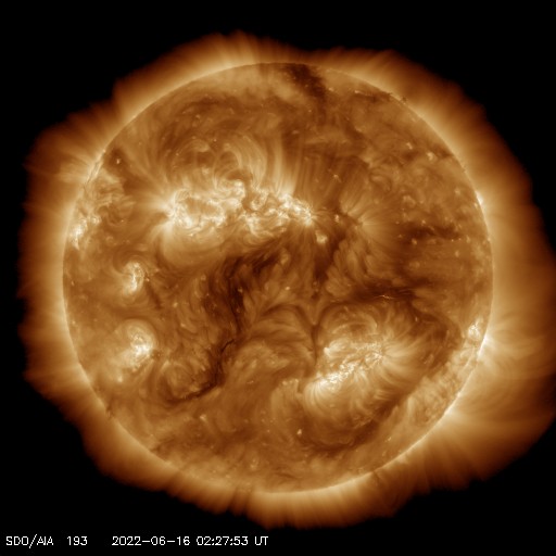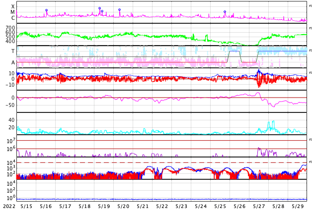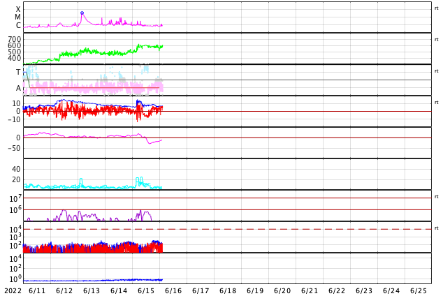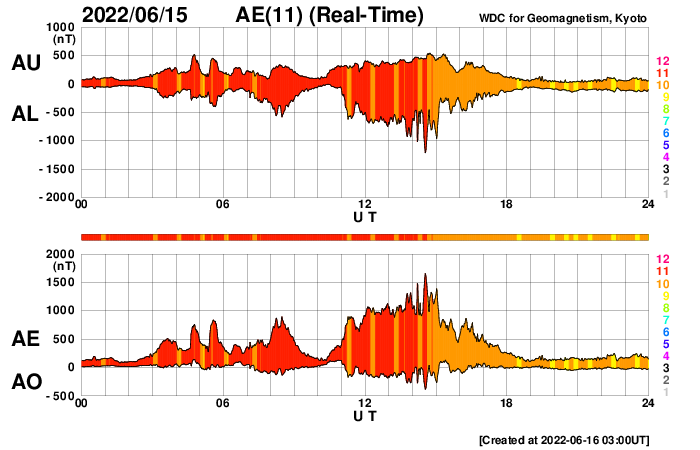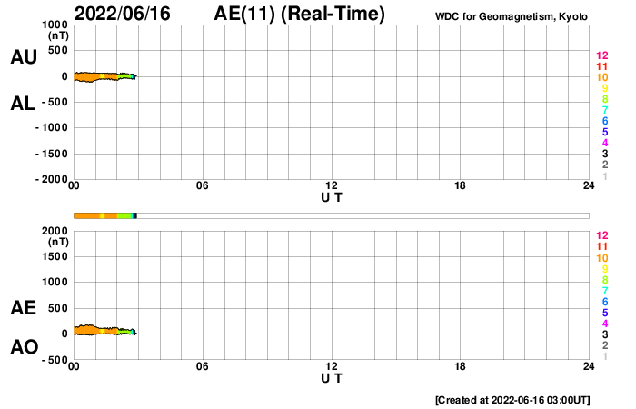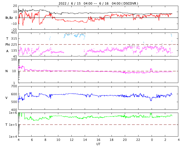 2022/ 6/16 12:20 更新 太陽風磁場が南向きに振れて、磁気圏の活動が強まりました。高速風は続いています。 担当 篠原 太陽風は、昨日の夕方まで12nTに強まった状態が続き、 その後、一段下がって、7〜8nTとやや強いくらいになりました。 しかし、この頃から磁場の南北成分が南向きに振れ続け、 -5〜 -7nTの状態が5時間ほど続きました。 太陽風の速度は580〜600km/秒に高まっていたので、 磁気圏の活動は強まって、 AE指数では1000〜1600nTの大規模の変化が 4時間ほど続いています。 今日に入る頃、磁場は北向きに切り替わり、 速度は570km/秒前後と高まった状態が続いていますが、 磁気圏の活動は静かになって、 AE指数の変化は目立たなくなっています。 CMEによって発生した磁場の強まりに、 コロナホールの高速風が重なって、 磁気圏活動が強まりました。 現在のSDO衛星AIA193の太陽コロナ写真では、 コロナホールは西に進んでいます。 太陽風の速度は、次第に下がっていくのではないでしょうか。 太陽は、中心の3030黒点群で発生した C3.2の小規模フレアが最大で、 その他はC1のフレアが4回発生した程度です。 黒点があちこちに見えていて、可視光写真はにぎやかですが、 X線のグラフは落ち着いています。