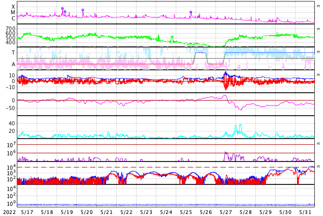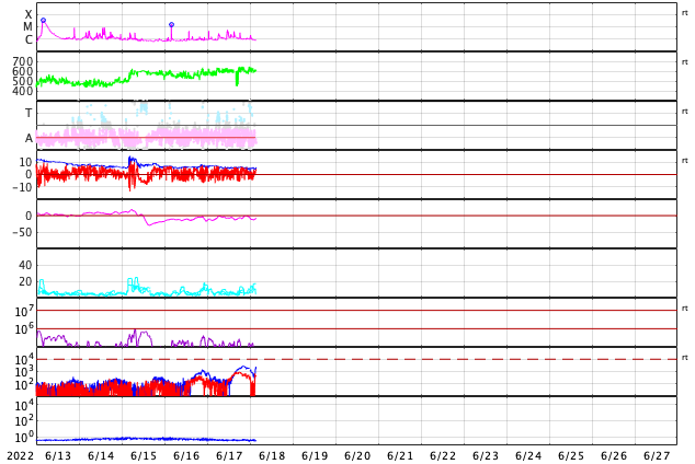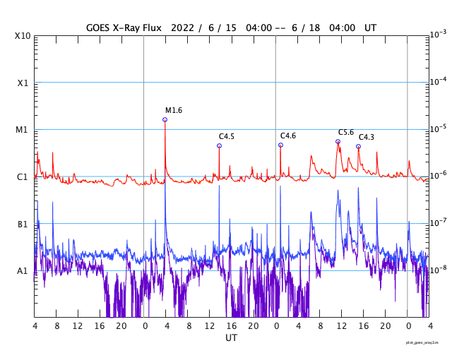 GOES衛星の太陽X線強度。赤・橙 = 0.1〜0.8 nm、青・紫 = 0.05〜0.4 nm (c) データ:NOAA/SWPC、作図:宇宙天気ニュース ![]() | ||||||||||||||||||||||||||||||||||||||||||||||||||||||||||||||||||||||||||||||||||||||||||||||||||||||||||||||||||||||||||||||||||||||||||||||||||||||||||||||||||||||||||||||||||||||||||||||||||||||||||||||||||||||||||||||||||||||||||||||||||||||||||||