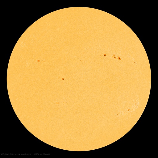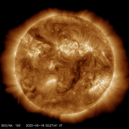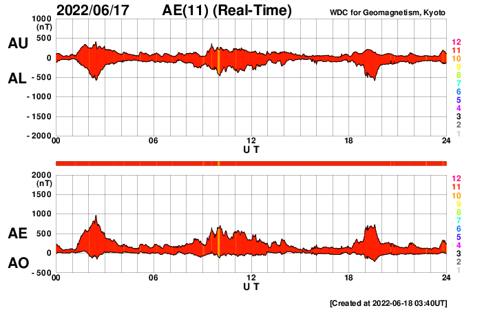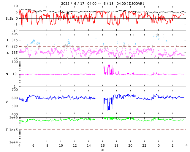 2022/ 6/18 12:52 更新 太陽風の速度は600km/秒に高まっています。 担当 篠原 太陽風の速度は、昨日のニュースの後に600km/秒へ高まり、 現在もこの状態が続いています。 磁場強度は、7nTから4nTヘ少し下がっています。 高速風領域の終わりが見え始めているのかもしれません。 磁場の南北成分は、北に振れたり、南に振れたりしています。 磁気圏の活動はやや高まった状態が続いていて、 AE指数は、700nTくらいの中規模の変化が度々発生しています。 SDO衛星AIA193では、コロナホールは特に見られず、 太陽風は次第に穏やかになりそうですが、 どうでしょうか。 太陽は、北西(右上)の3030黒点群で C5.6、C4.3などの小規模フレアが、 南西(右下)の3037群でC3.3の小規模フレアが発生しています。 しかし、特に活動的というほどの領域はありません。 ![]() SDO衛星のAIA193カメラによる太陽コロナの様子 (c) SDO (NASA) ![]() SDO衛星による太陽の可視光写真。マウスの矢印を写真に重ねると、黒点番号付きの写真に切り替わります。 (c) SDO (NASA) ![]() DSCOVRが観測した太陽風の磁場(黒線は全体の強度、赤線は南北成分) 磁場の向き、プラズマの密度、速度、温度 (c) データ:NOAA/SWPC、作図:宇宙天気ニュース ![]() AE指数(速報値) 下段のAEグラフの値が高くなると、オーロラ活動が活発化しています。 (c) 京都大学WDC ![]() ![]() 27日の太陽周期に合わせた図 太陽が同じ面を地球に向けていた27日前の変化から、今後を予想することができます。 (c) 作図:宇宙天気ニュース