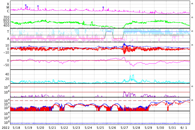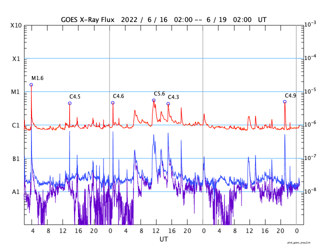GOES衛星の太陽X線強度。赤・橙 = 0.1〜0.8 nm、青・紫 = 0.05〜0.4 nm (c) データ:NOAA/SWPC、作図:宇宙天気ニュース ![]() | |||||||||||||||||||||||||||||||||||||||||||||||||||||||||||||||||||||||||||||||||||||||||||||||||||||||||||||||||||||||||||||||||||||||||||||||||||||||||||||||||||||||||||||||||||||||||||||||||||||||||||||||||||||||||||||||||||||||||||||||||||||||||||||||||||